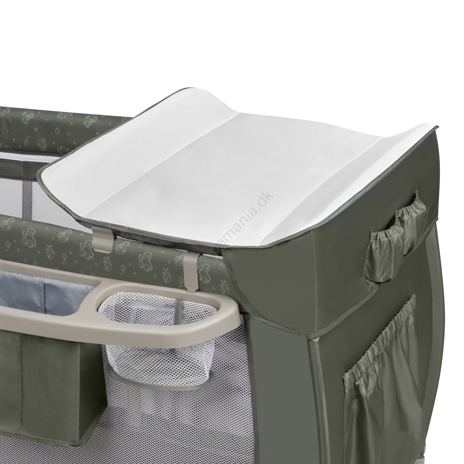 • Med i pakken: puslebord med sidelommer (til bleer, babypulver osv.), opbevaringskurv med to rum, stor myggenet, baldakin og en bøjle med plysdyr.