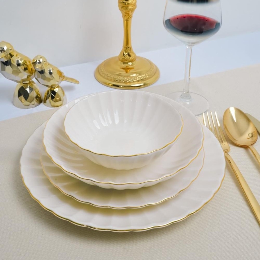 • 24-delt spisesæt i hvidt porcelæn med gulddetaljer