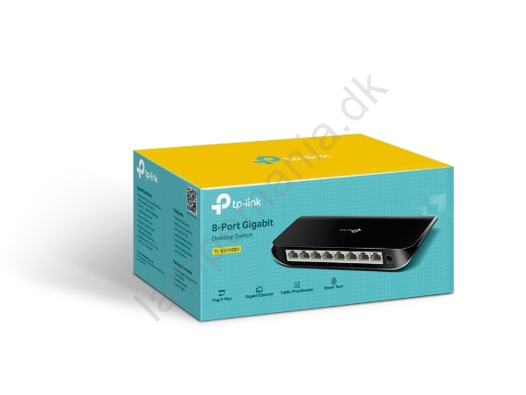 • 8 Gigabit RJ45-porte til tilslutning af forskellige netværksenheder (PC, NAS, printere, router).