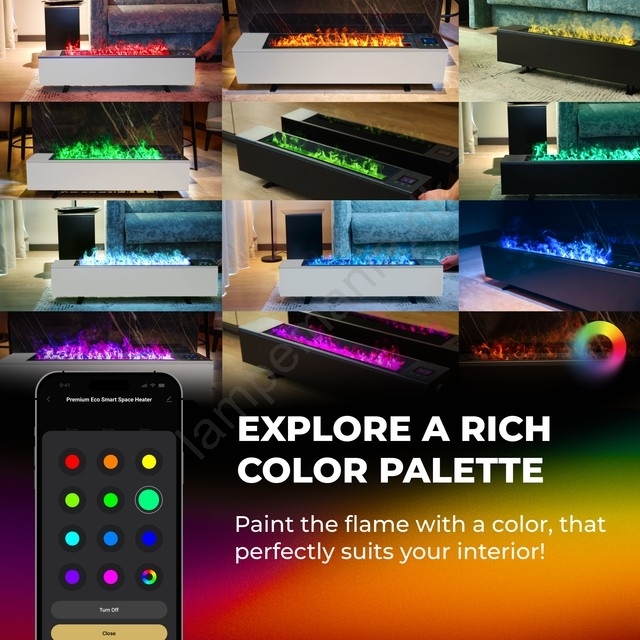 • Enheden kan styres via en smart-app over Wi‑Fi; du kan indstille timer, opvarmningsindstillinger og farven på effekten.