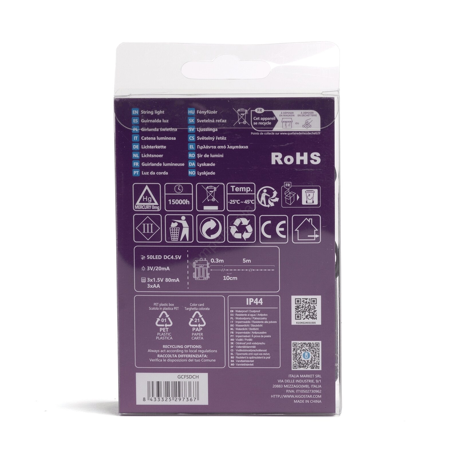 • Aigostar - LED-lyskæde til udendørs brug, 50 LED / 8 funktioner, 3xAA, 5,3 m, IP44, multifarvet