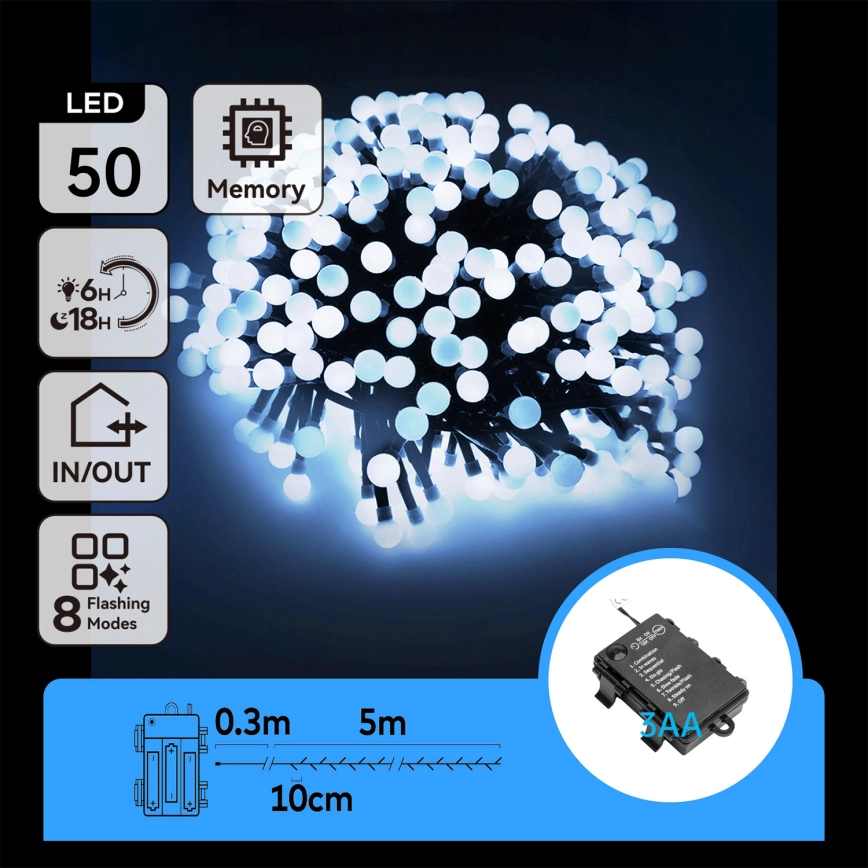 • Aigostar -Udendørs LED julelyskæde 50xLED/8 funktioner 3xAA 5,3m IP44 kold hvid