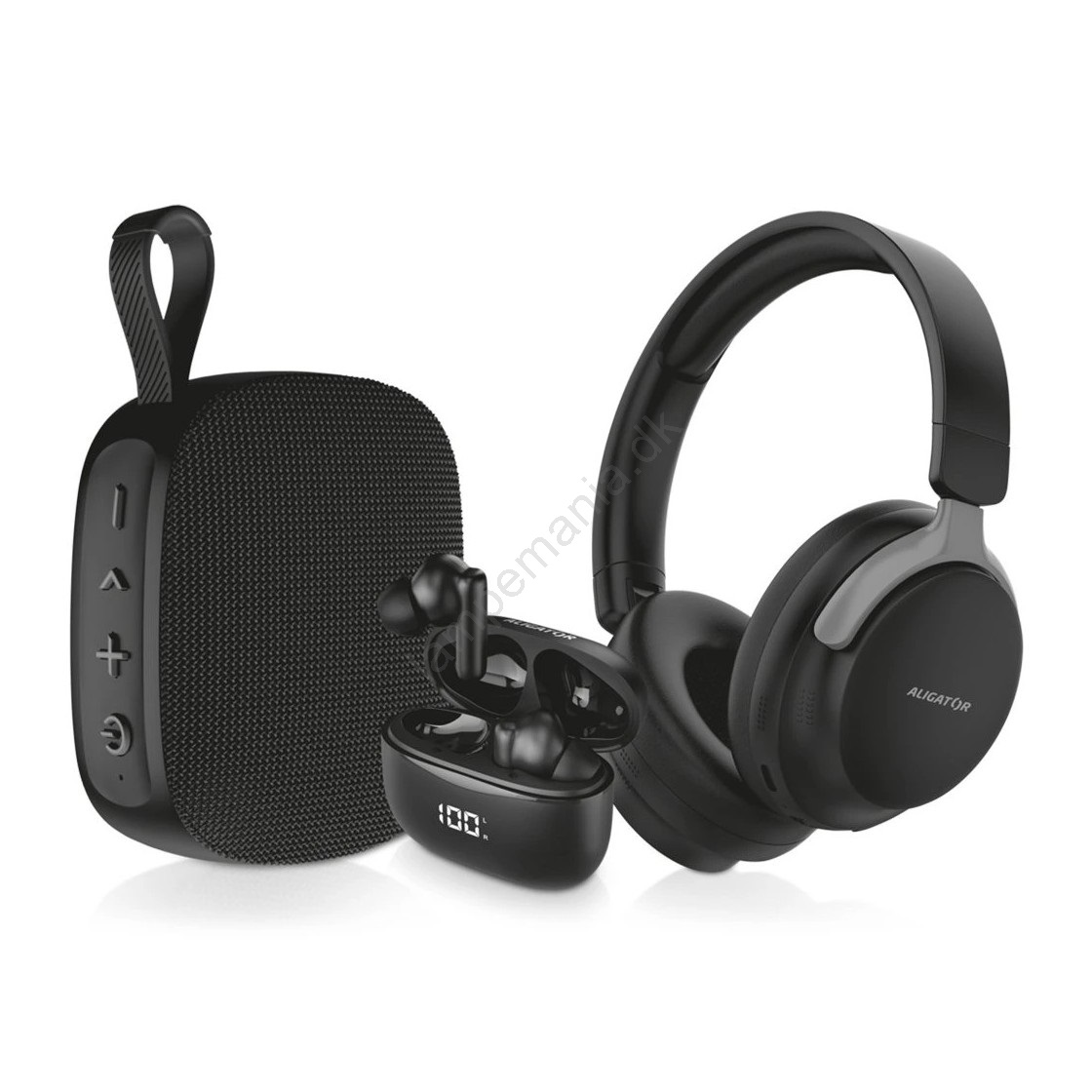 Aligator AUC001 - AUDIO COMBO 3 i 1: over-ear hovedtelefoner 150 mAh, trådløse øretelefoner 200 mAh + 2 x 30 mAh og højttaler 1200 mAh
