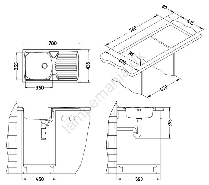 • Pakkens indhold: rustfri vask, fastgørelsesbeslag og pakninger, bundventil 1 1/2", sifon med afgang til opvaskemaskine, prop, køkkenarmatur, tilslutningsslanger, monteringssæt.