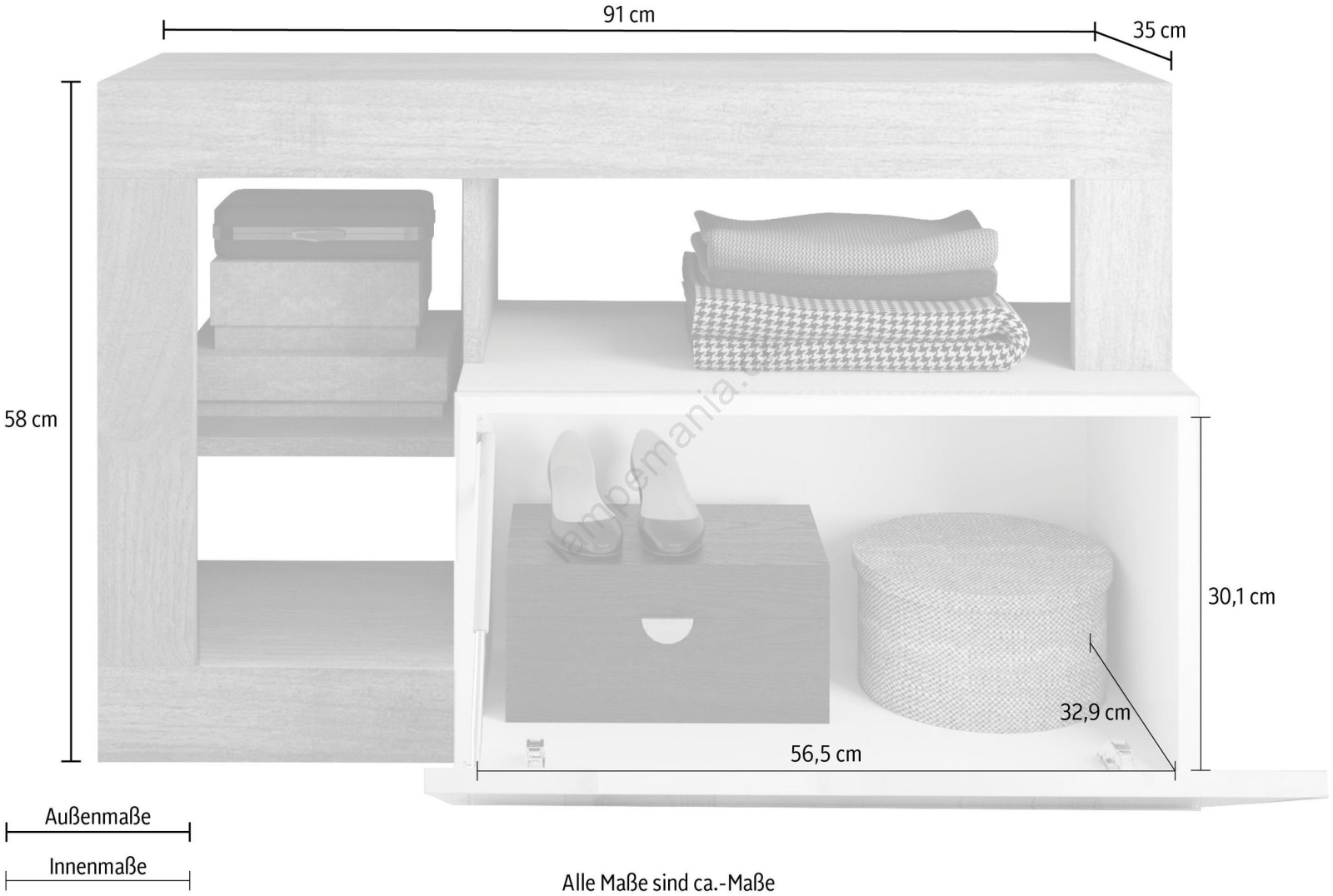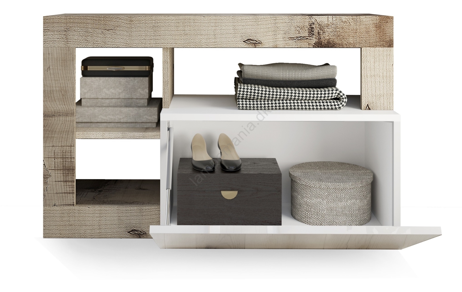 • Den har 3 åbne hylder samt en indvendig hylde med vippeåbning til opbevaring af tasker, sko og sæsonvarer.