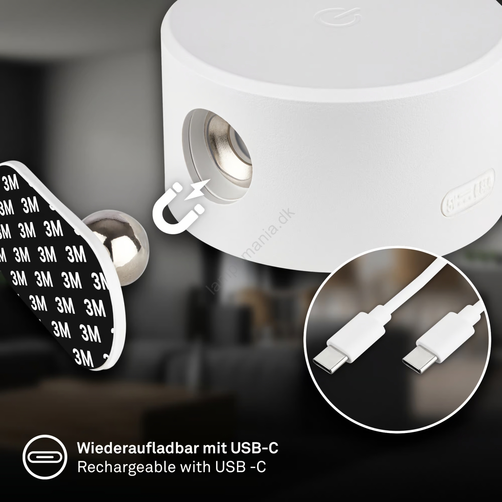 • Lampen drives af et 1500 mAh-batteri, som nemt kan oplades via det medfølgende 0,5 m USB-C-kabel.