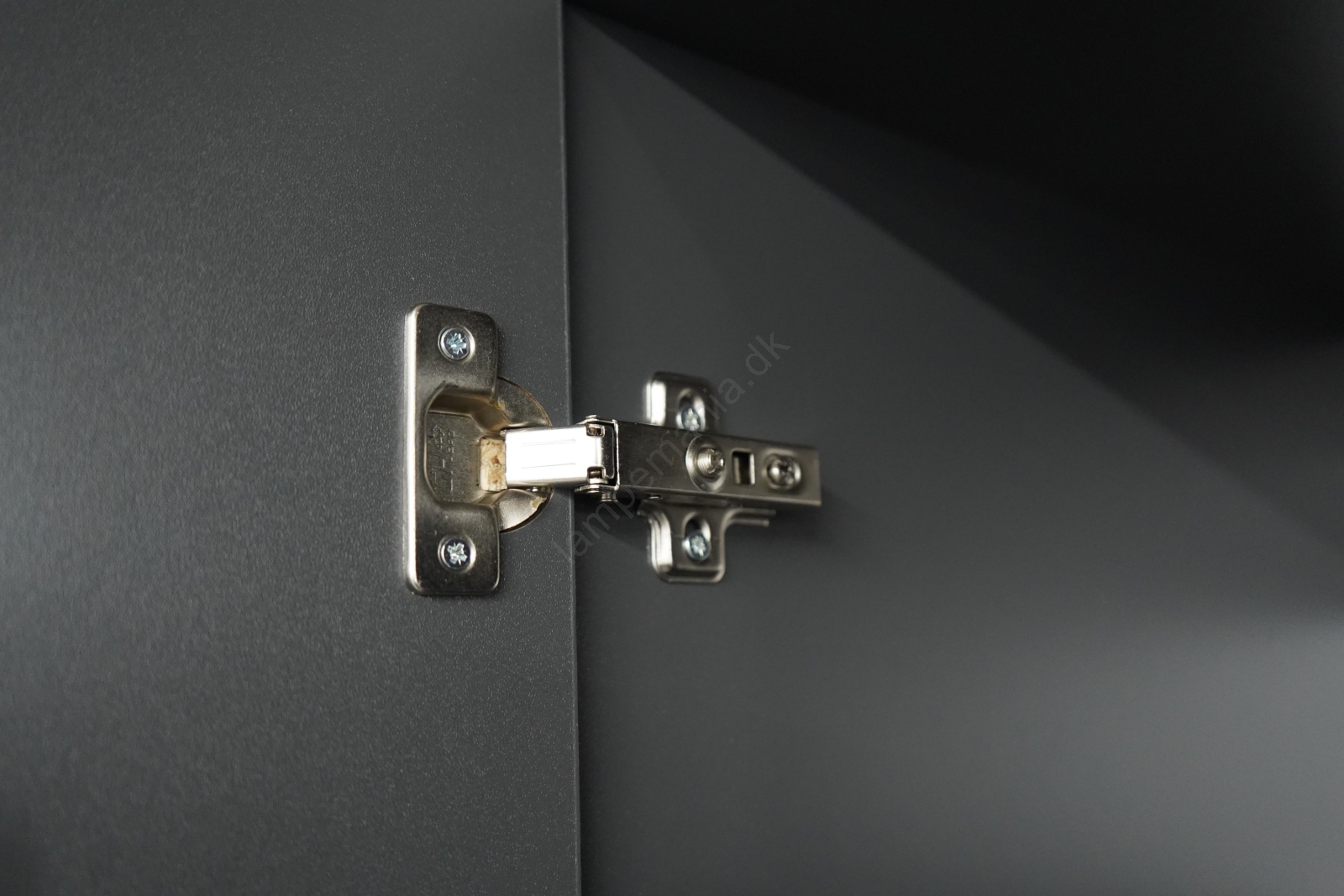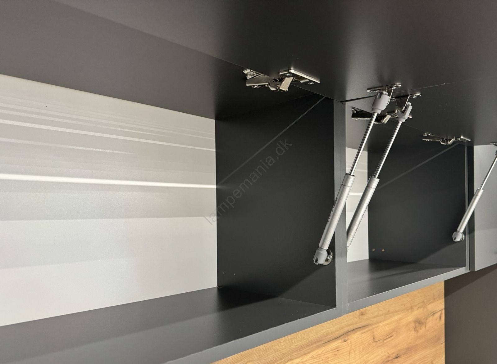 • Øverste skabe er udstyret med gasdæmpere, i skufferne er indbyggede førsteklasses indkapslede metalskinner.