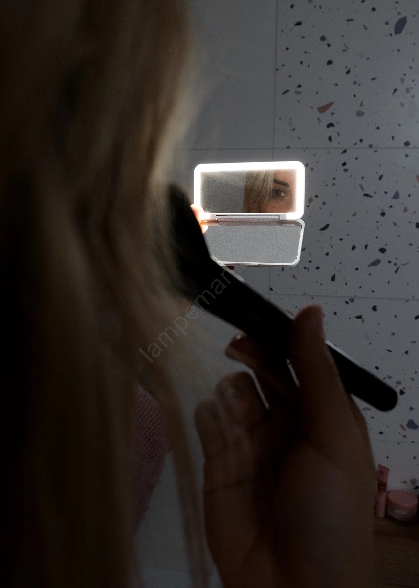• På grund af sin kompakte størrelse passer spejlet i håndtasken, rygsækken eller toilettasken.