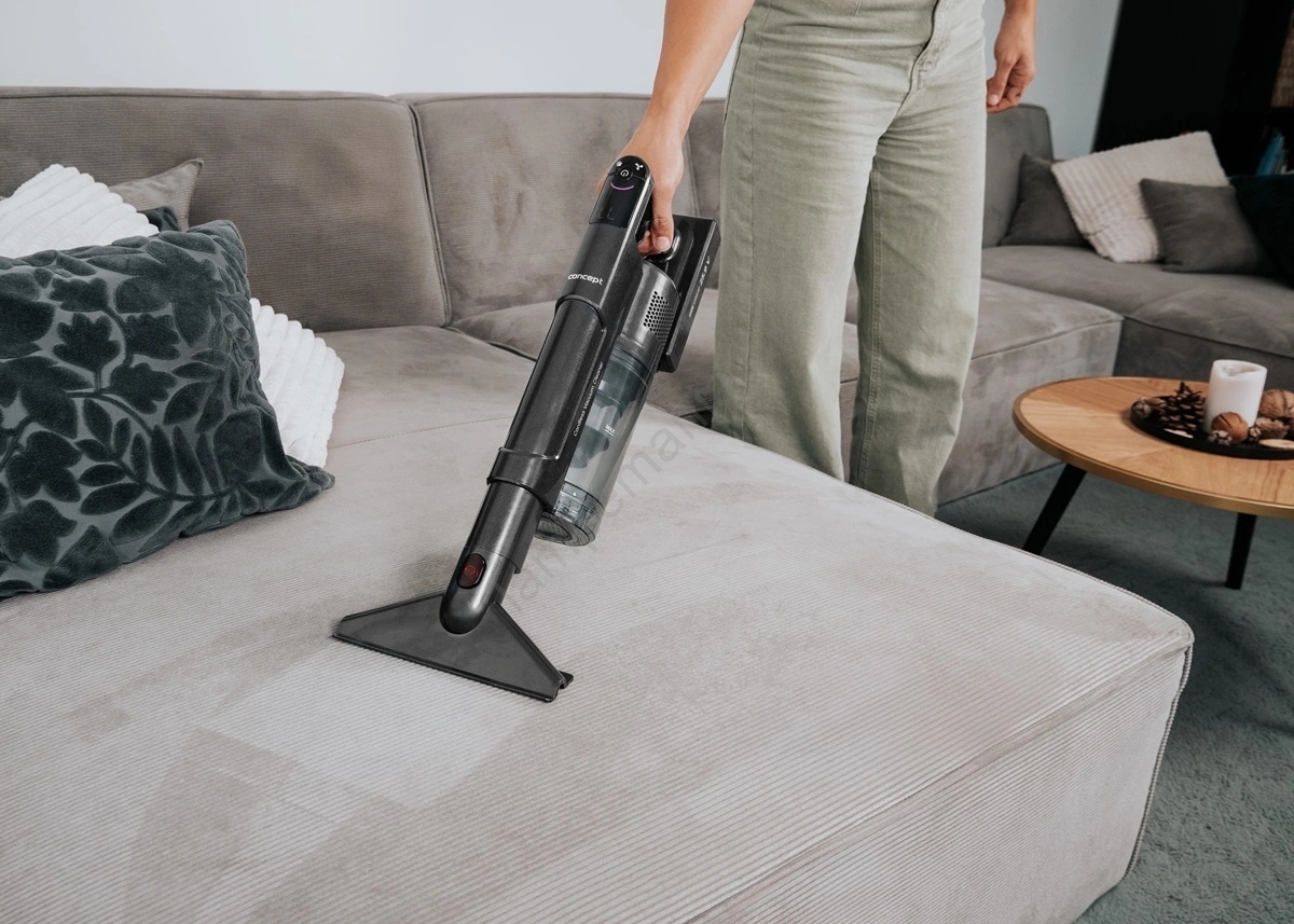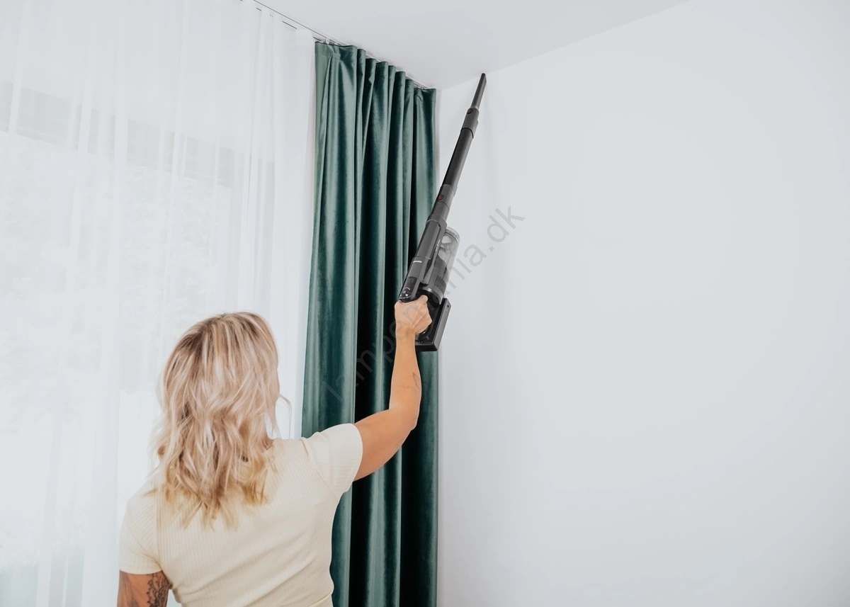 • Takket være det udtagelige Li-ion-batteri med en kapacitet på 2200 mAh klarer den op til 50 minutters drift på en opladning i MIN-tilstand, hvilket er tilstrækkeligt til almindelig rengøring af hårde gulve.