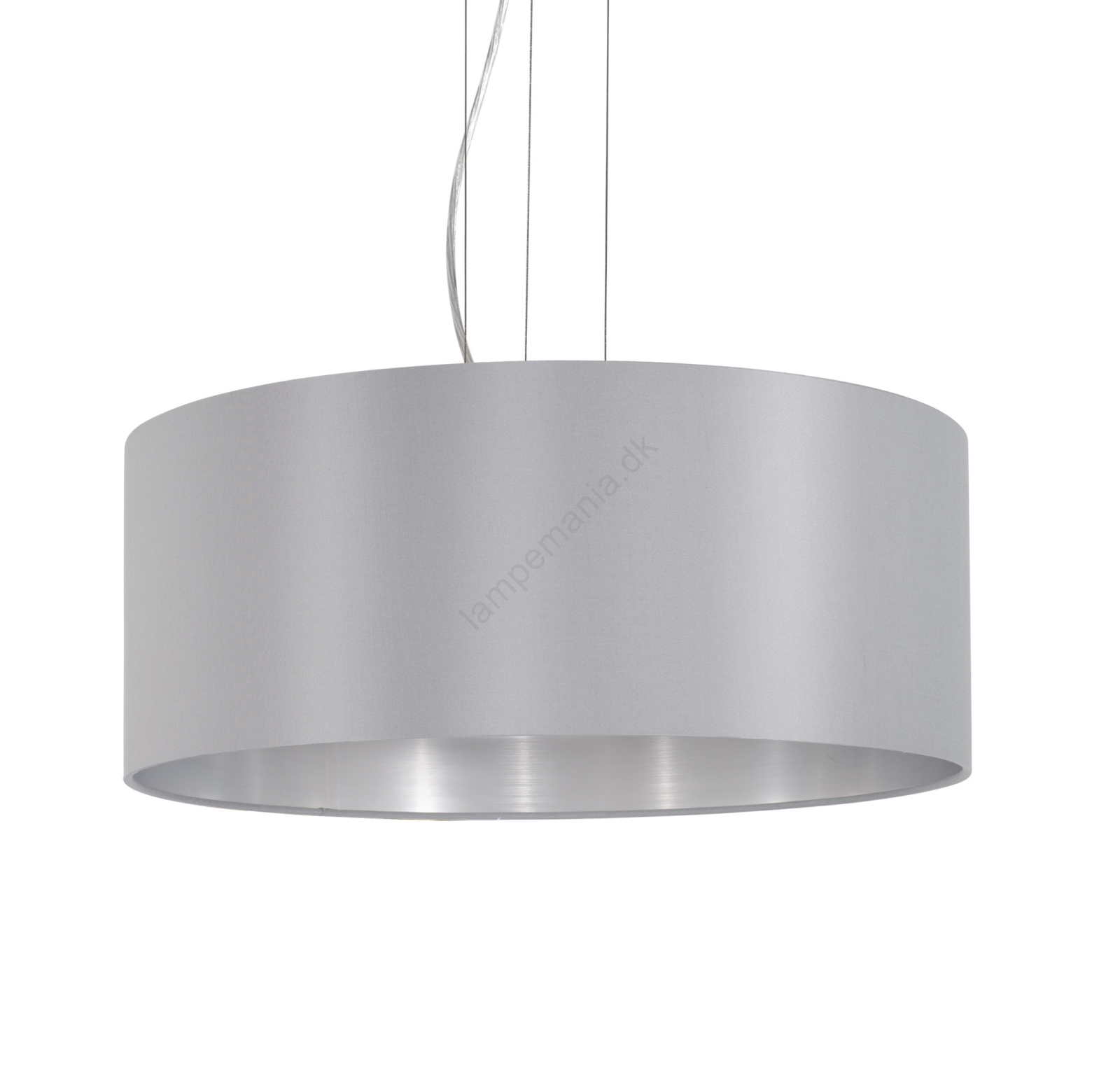 • Lampens udseende fremhæves af en skærm lavet af tekstil med en ydre grå farve og en indre sølvfarve, suppleret med en metalophæng.