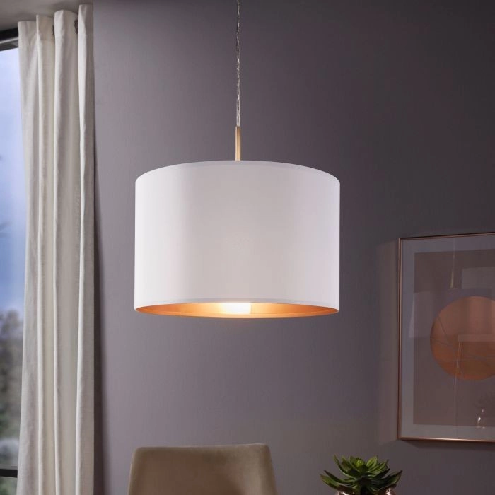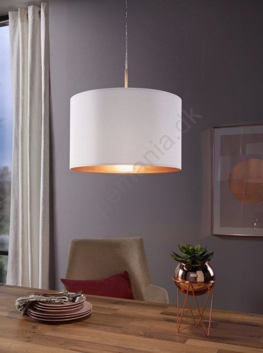 • Det dominerende element er en hvid tekstilskærm med en kobber inderside.