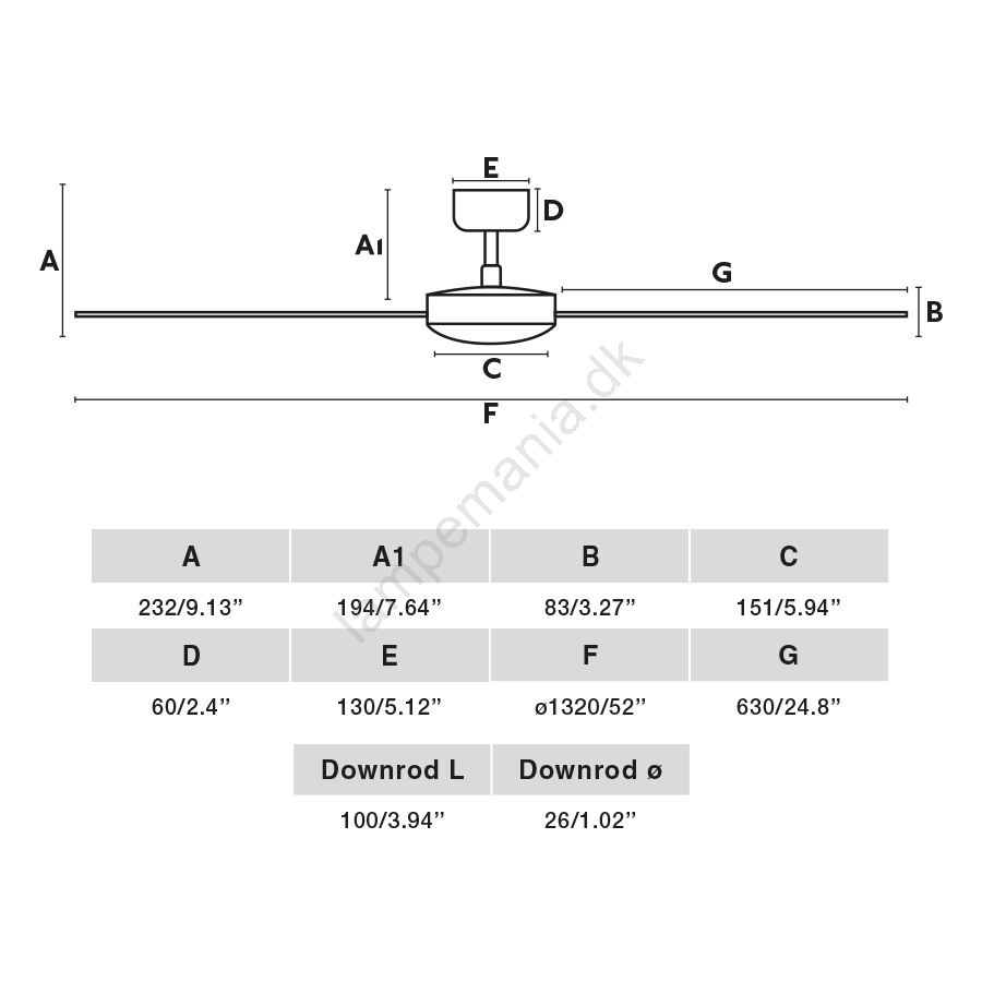 • Jævnstrømsmotoren har 6 justerbare hastigheder med et strømforbrug på 4-6-10-17-24-35 W og 71-95-115-135-158-174 omdr./min. afhængig af hastighed.