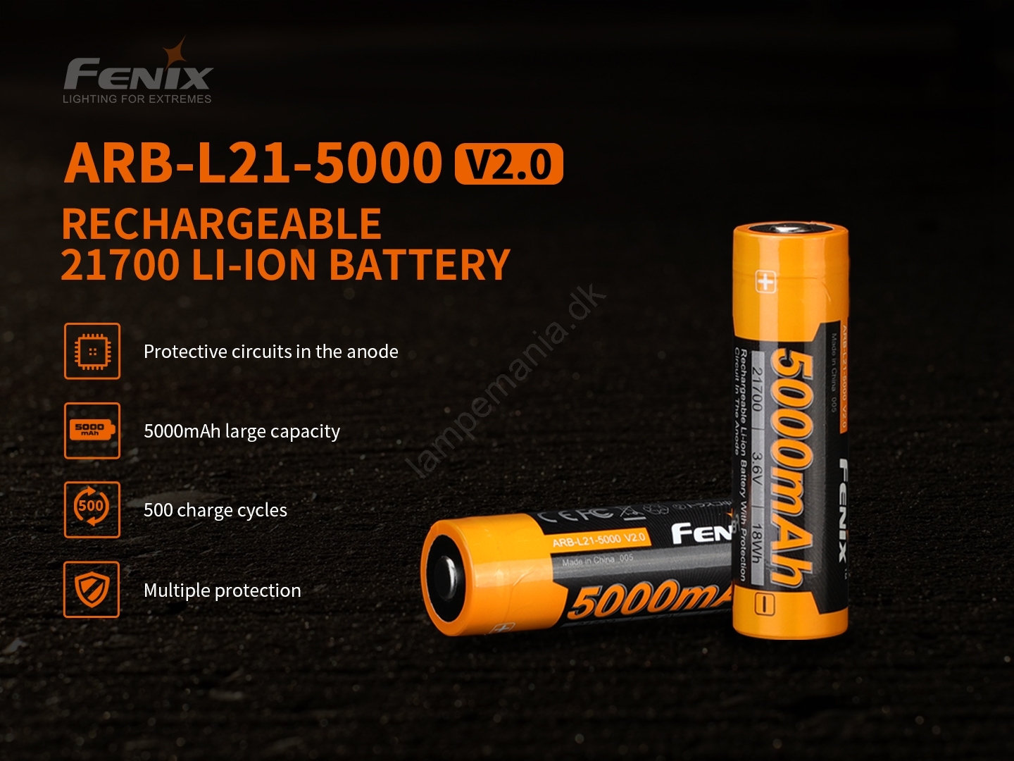 • Opgraderede genopladelige Fenix 21700 5000 mAh V2.0 (ARB-L21-5000 V2.0) med beskyttelseselektronik (protected) er baseret på førende LiNiCoO2-teknologi, som giver øget sikkerhed og længere levetid.