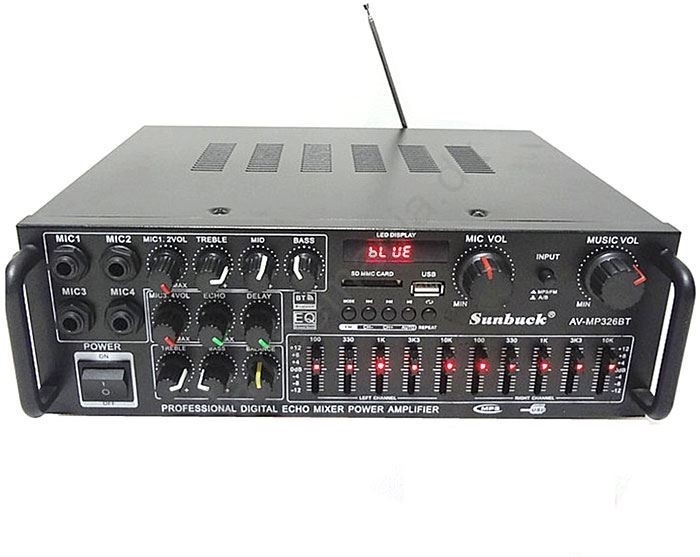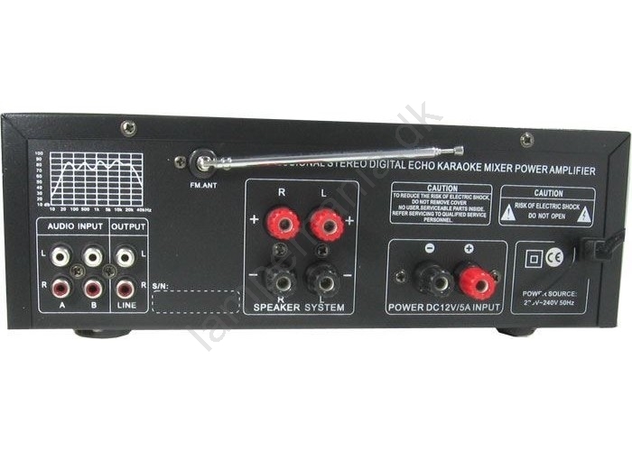 • LF-forstærker med equalizer, Bluetooth, MP3-afspiller (USB- eller SD-slot), FM-radio, alt sammen med fjernbetjening.