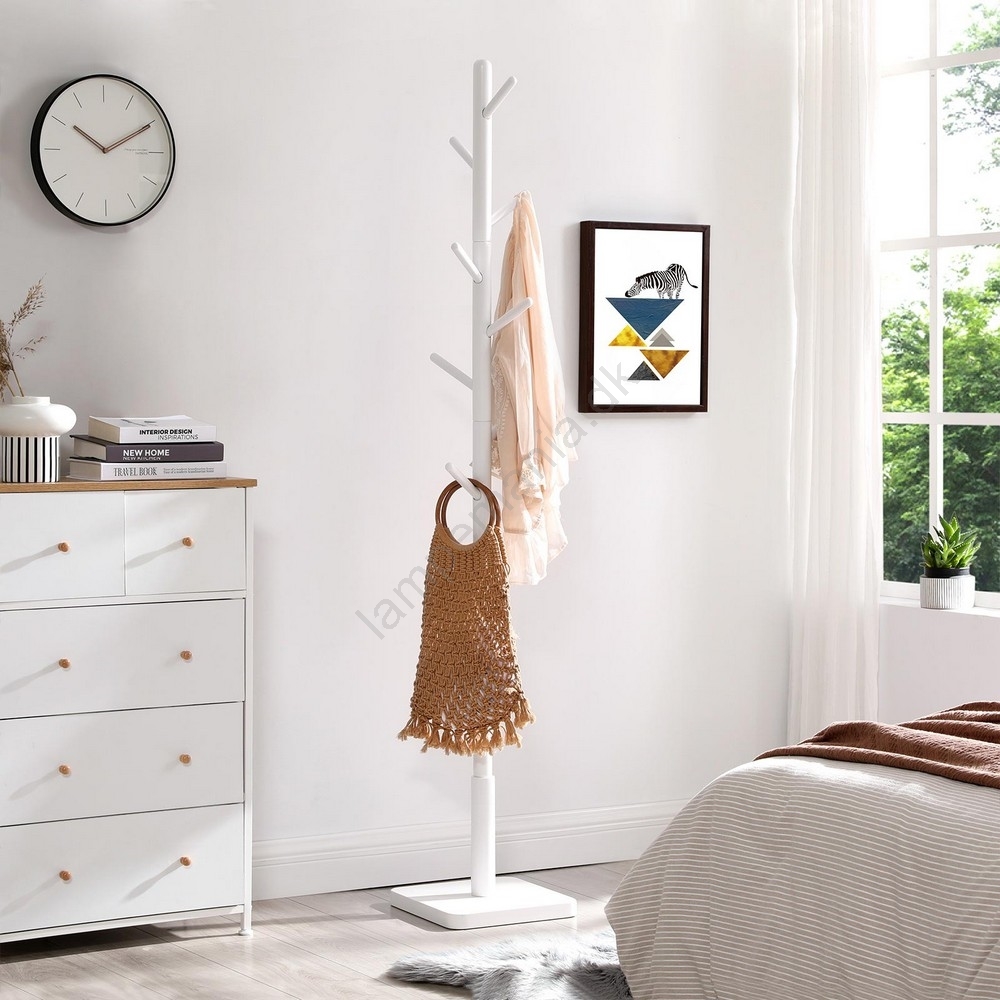 • Lakken giver frakkestativet en glat overflade, som ikke kun forhindrer, at dine beklædningsgenstande flænges eller tager skade, men også får stativet til at bevare et flot udseende i dit hjem i mange år.