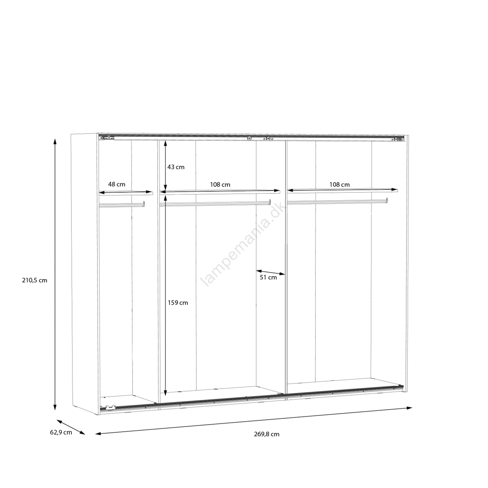 • Skabet har garderobestænger, hylder og stor opbevaringsplads til dit tøj, dine tasker og sæsonartikler.