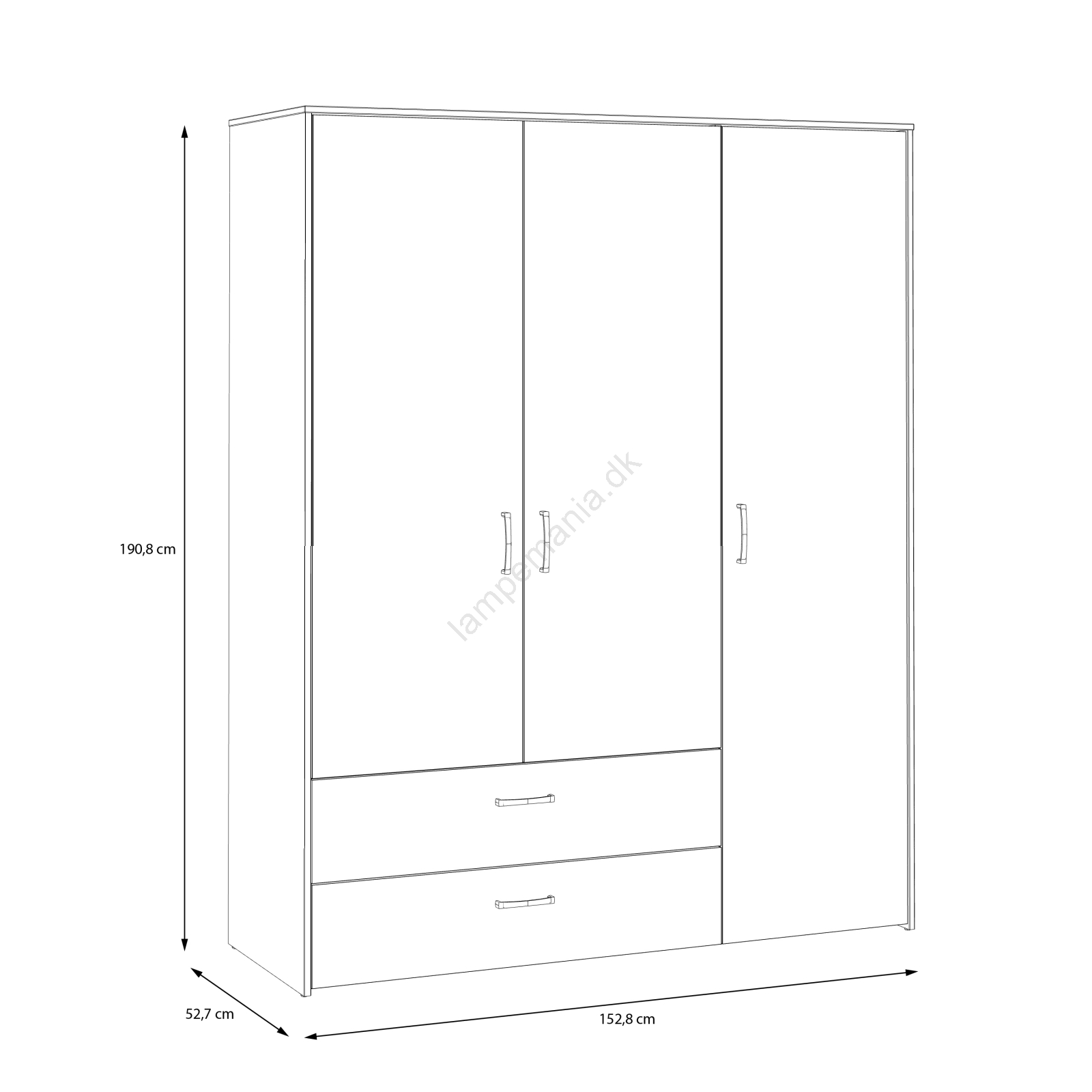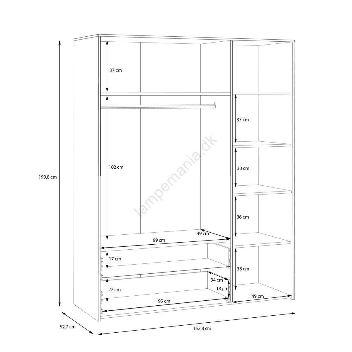 • Skabet har en tøjstang, hylder, skuffer og rigelig opbevaringsplads til dit tøj, tasker og sæsonsager.