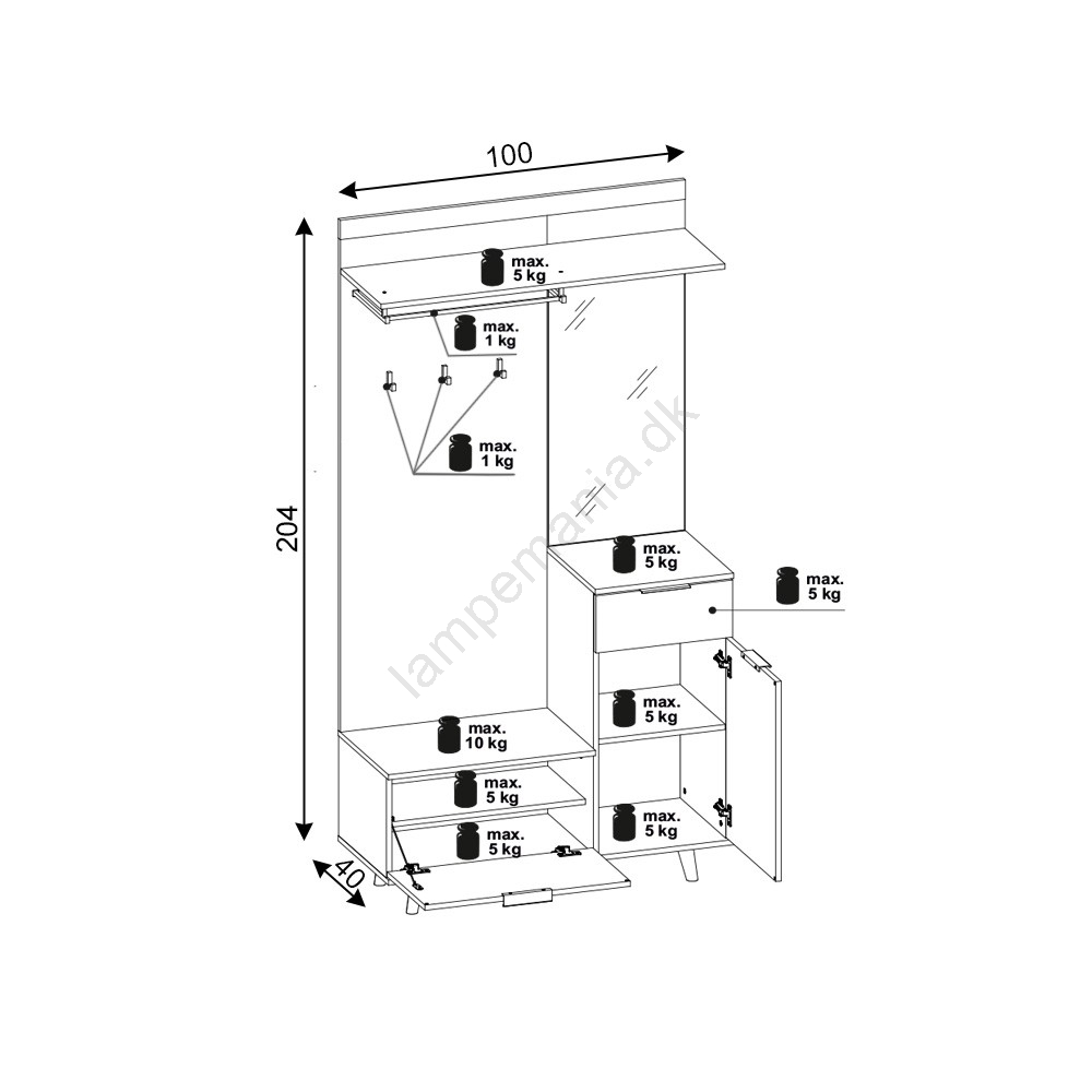 • Hylder, kroge, frakkestang og et stort spejl giver præcis det, du har brug for.
