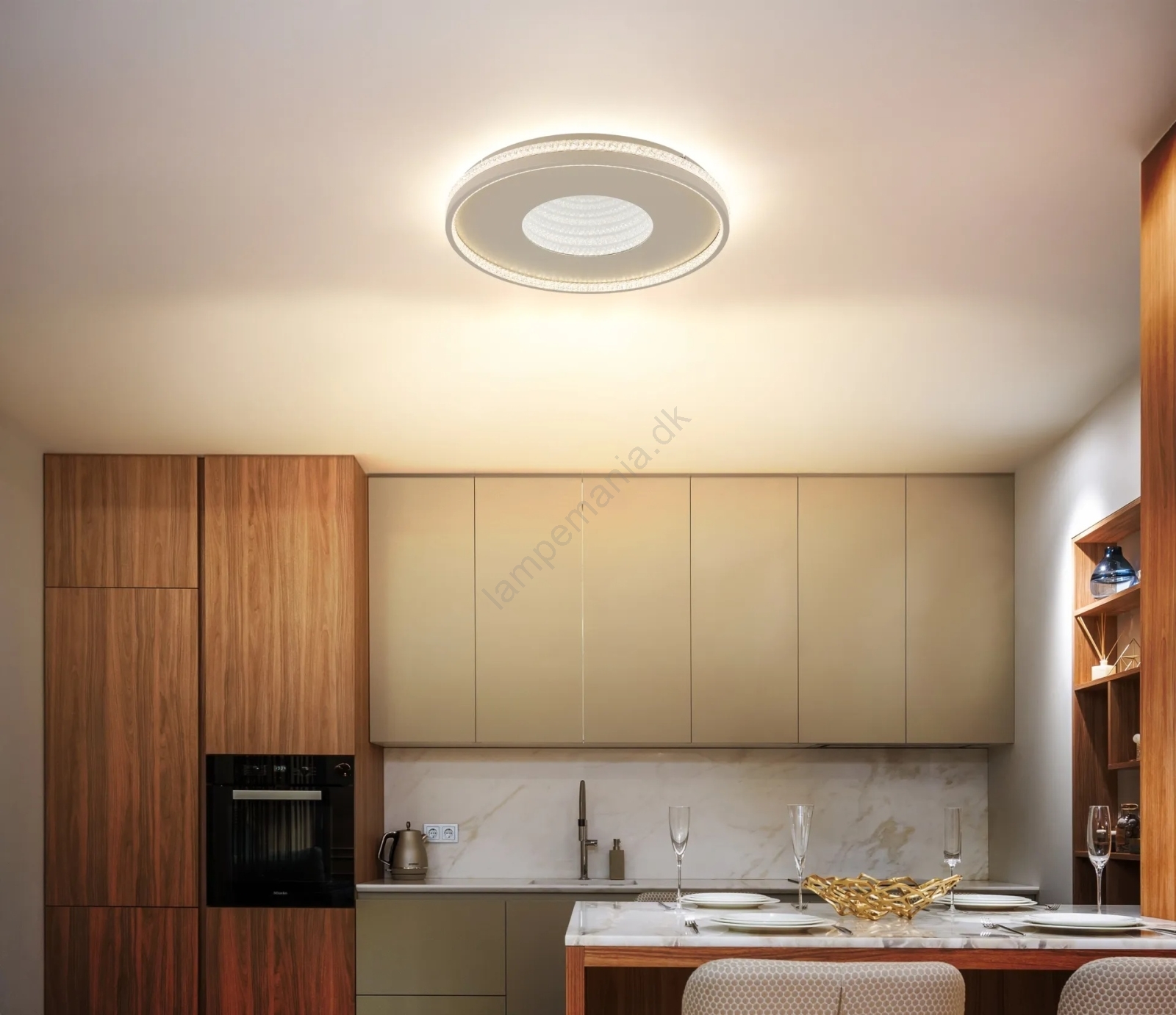 • Kombinationen af en sandfarvet metalkrop og akrylkrystaller skaber en imponerende lysvirkning.
