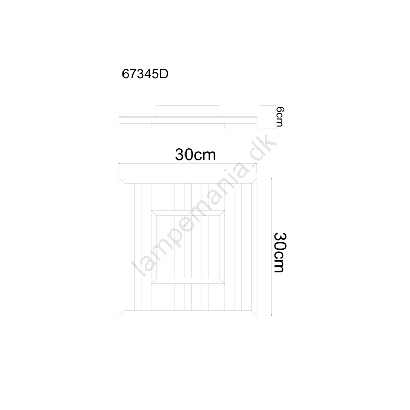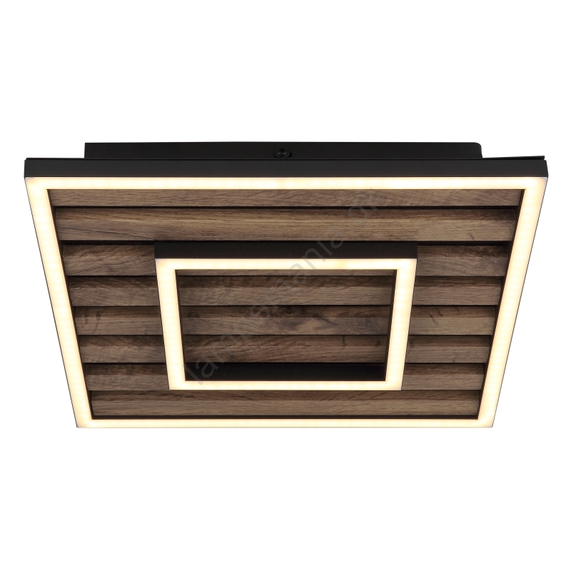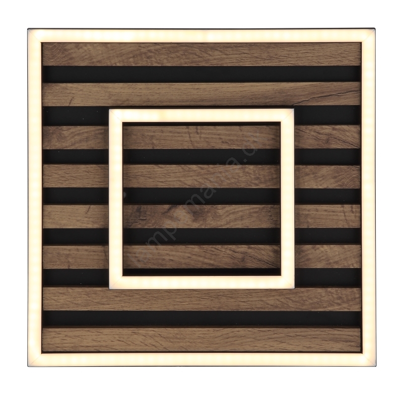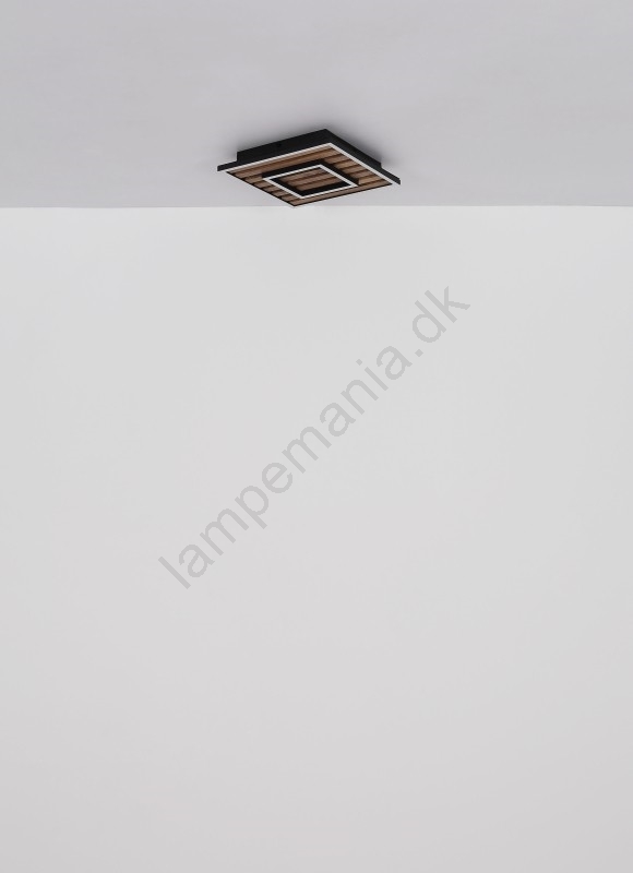 • Firkantet form med sort ramme, suppleret med MDF-plade med imitation af mørkt træ og opal plastdæksel.