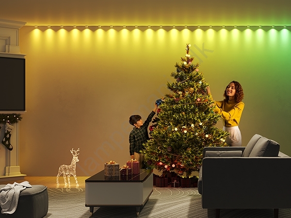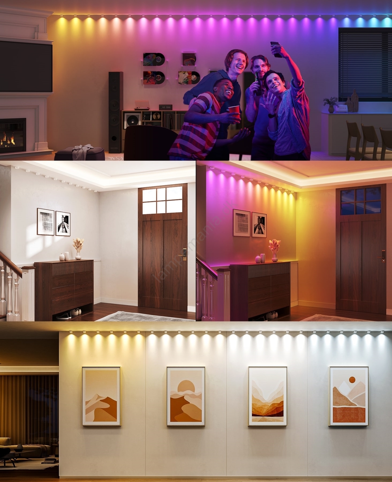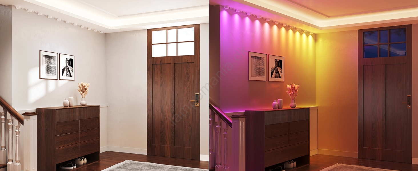 • Takket være RGBIC-teknologien kan hver spot styres individuelt med valg af RGB-tone, hvid farvetemperatur og lysstyrke.