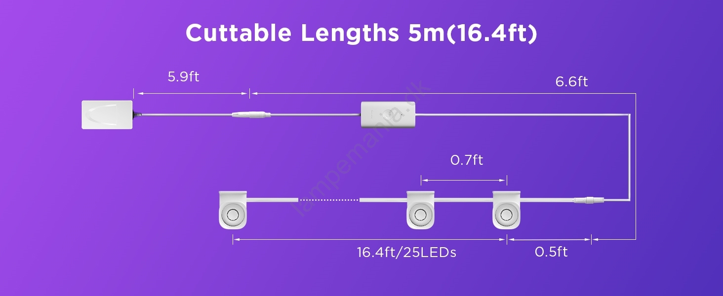 • Kæden består af 25 uafhængigt programmerbare LED-lys fordelt over 5 meter, som forvandler en kedelig væg til et stort RGB-kunstværk.