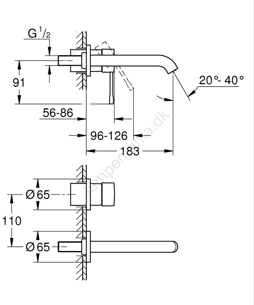 • Afstanden mellem hullernes centre er 110 mm, udløbslængde 183 mm.