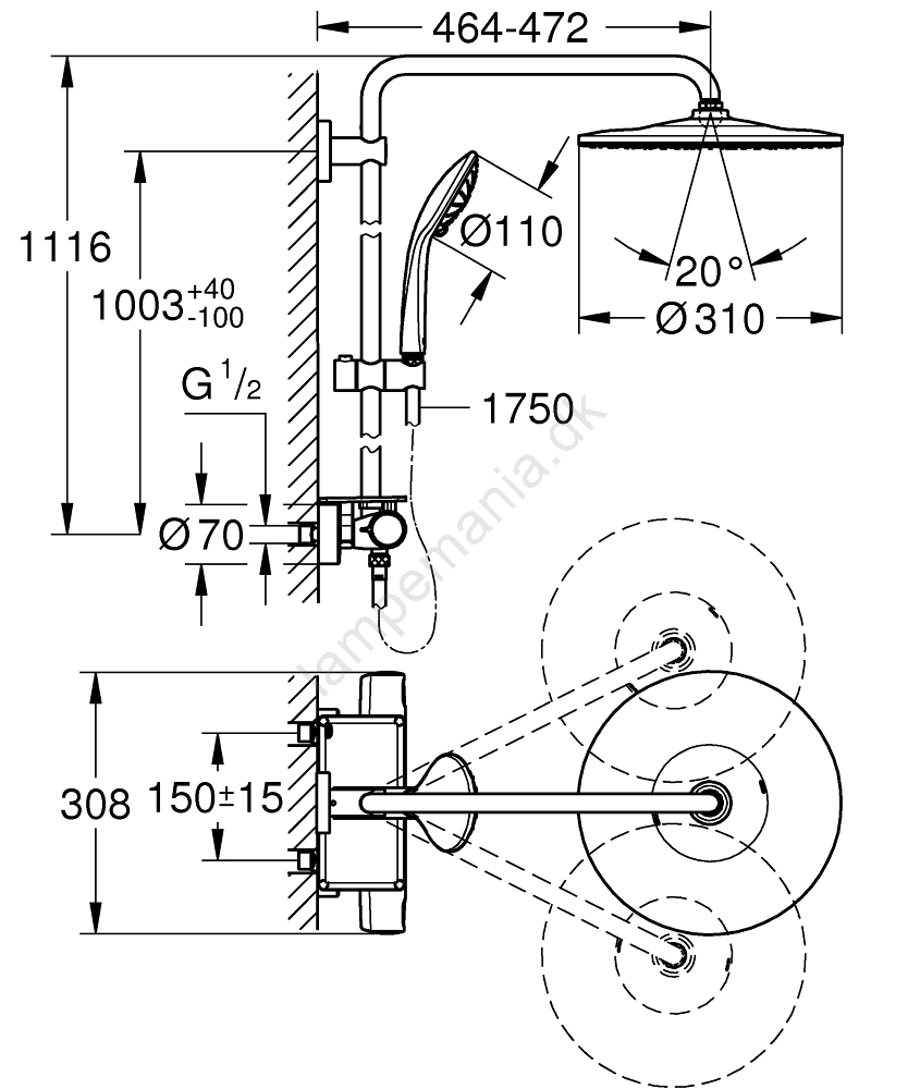 • Vægmonteret termostat Precision med Aquadimmer-funktion til nem omstilling mellem udløb.