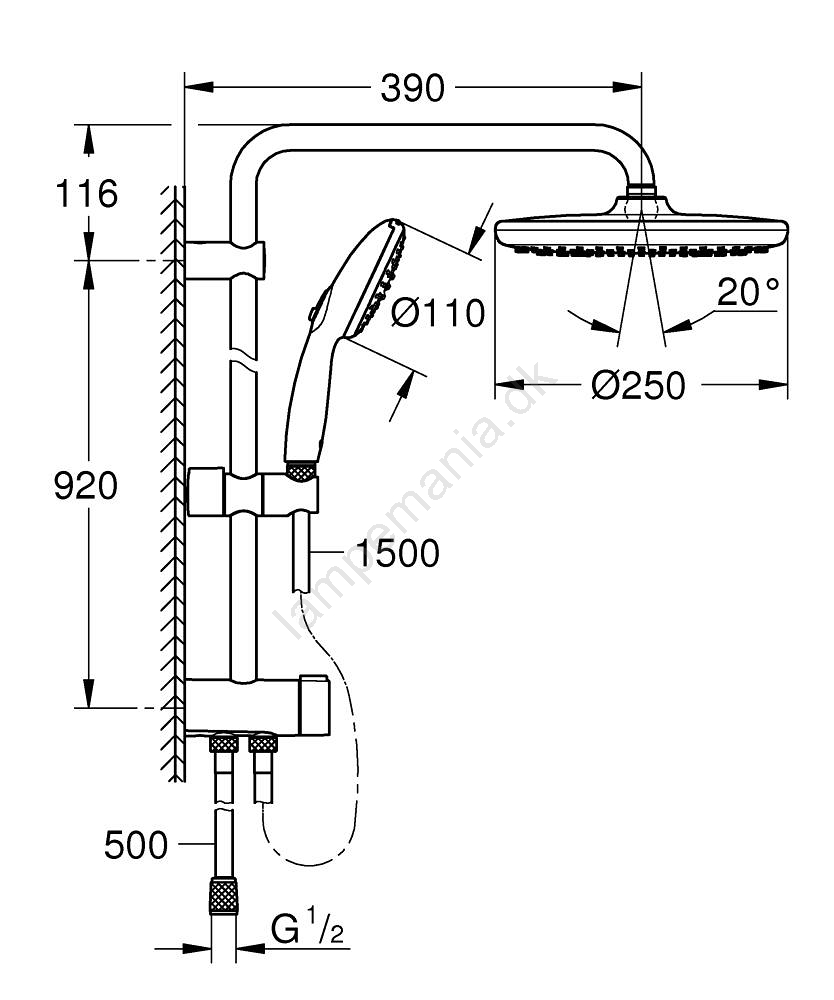 • Vandret brusearm på 390 mm, justerbar før installation for optimal placering.