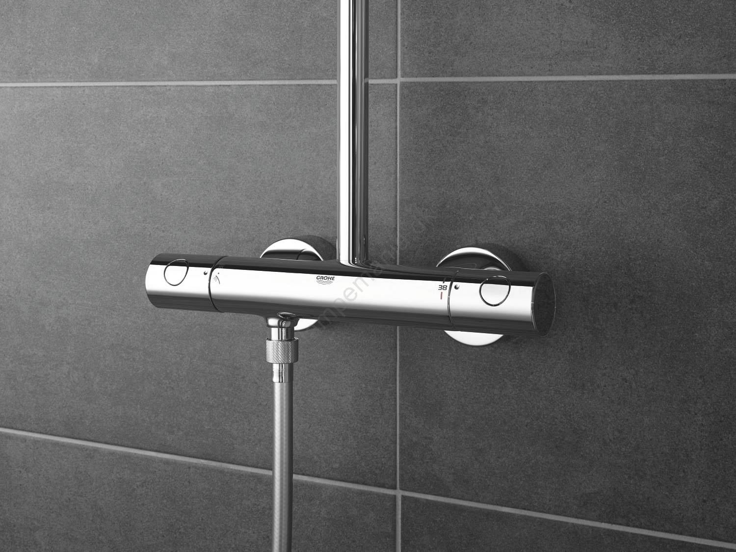 • Vægmonteret termostatisk brusebatteri med Aquadimmer-funktion gør det nemt at skifte mellem hoved- og håndbruser.