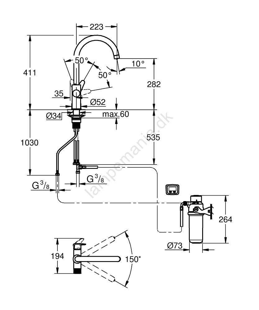 • Svingbar rørudløb med en svingvinkel på 150° gør det lettere at fylde og rengøre større beholdere.