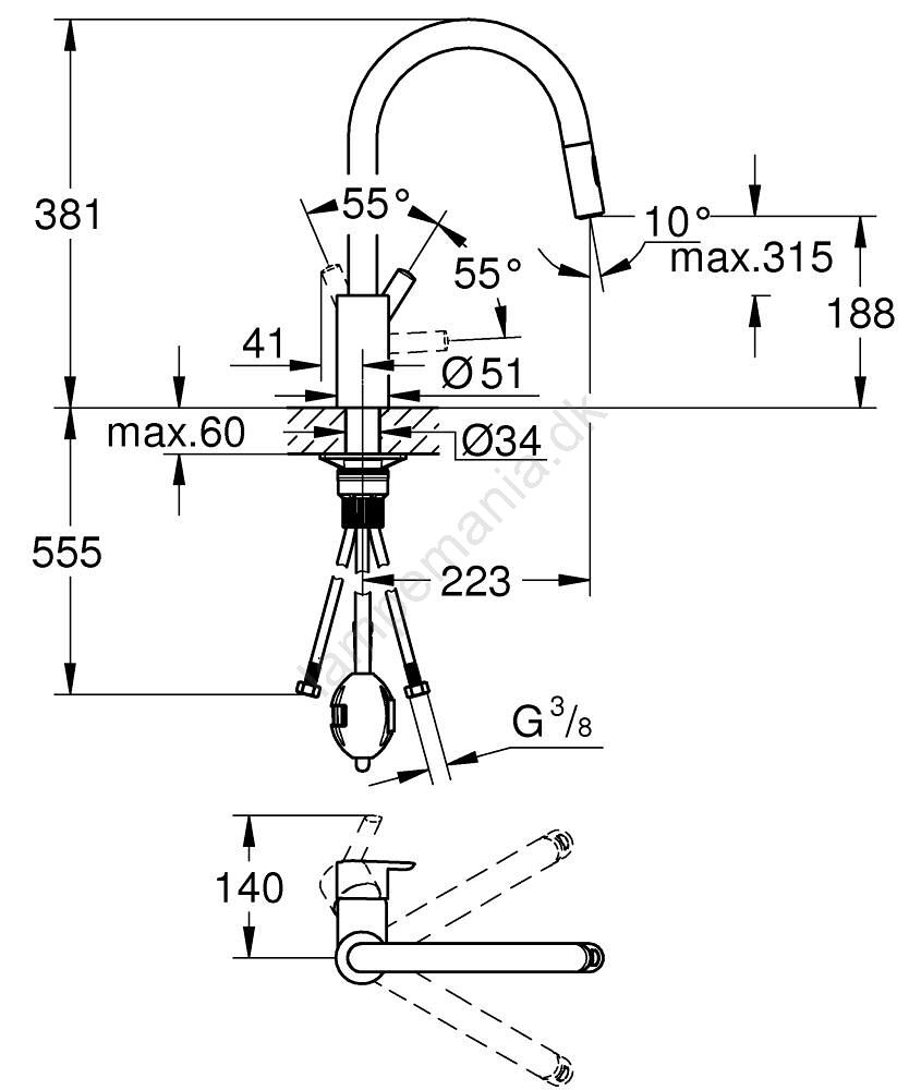 • Svingbar rørudløb med 360° drejefunktion for maksimal fleksibilitet under brug.