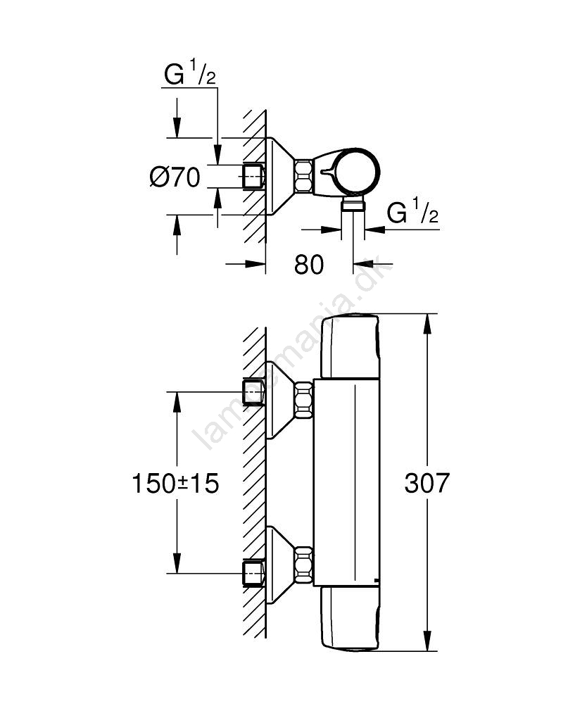 • Vægmonteret termostatisk brusebatteri til præcis regulering af vandtemperaturen.