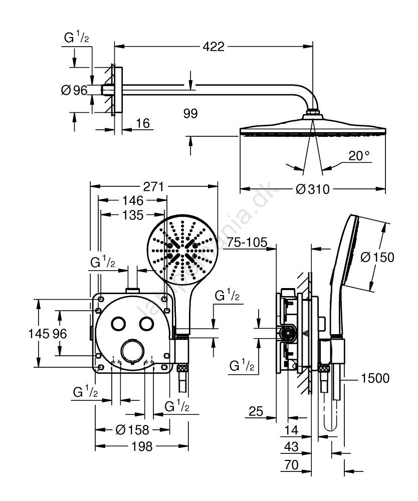 • Hovedbruser Vitalio Rain Mono 310 med en diameter på 310 mm og brusearm på 422 mm.