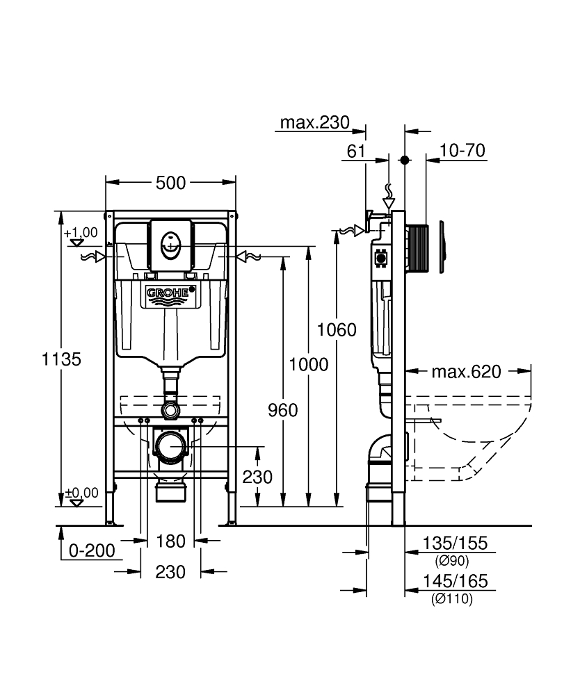 • GROHE Rapid SL installationssystem til væghængte toiletter med en højde på 1,13 m.