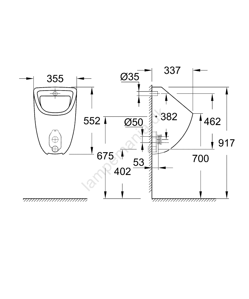 • Til installation skal urinal-sifon 39 732 000 (vandret afløb) eller 39 733 000 (lodret afløb) bestilles separat.