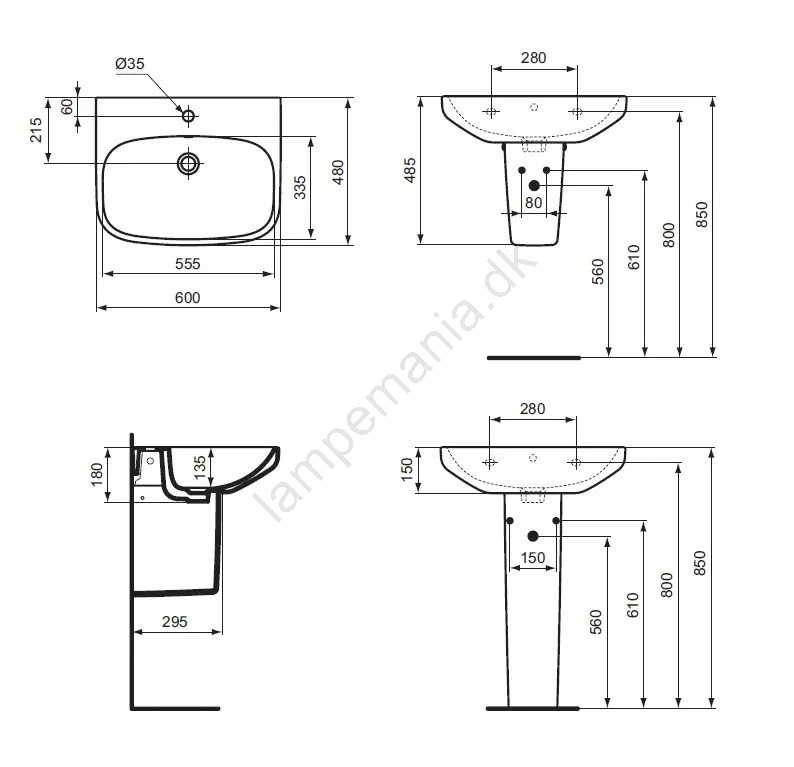 • For æstetisk afdækning af sifonen kan håndvasken kombineres med en søjle eller en halvsøjle.