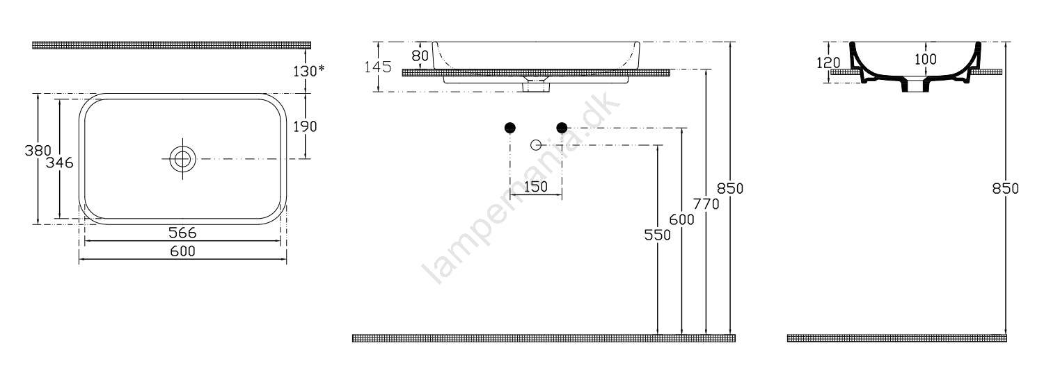 • Vasken kan monteres på væggen, placeres oven på bordpladen eller nedfældes i bordpladen.