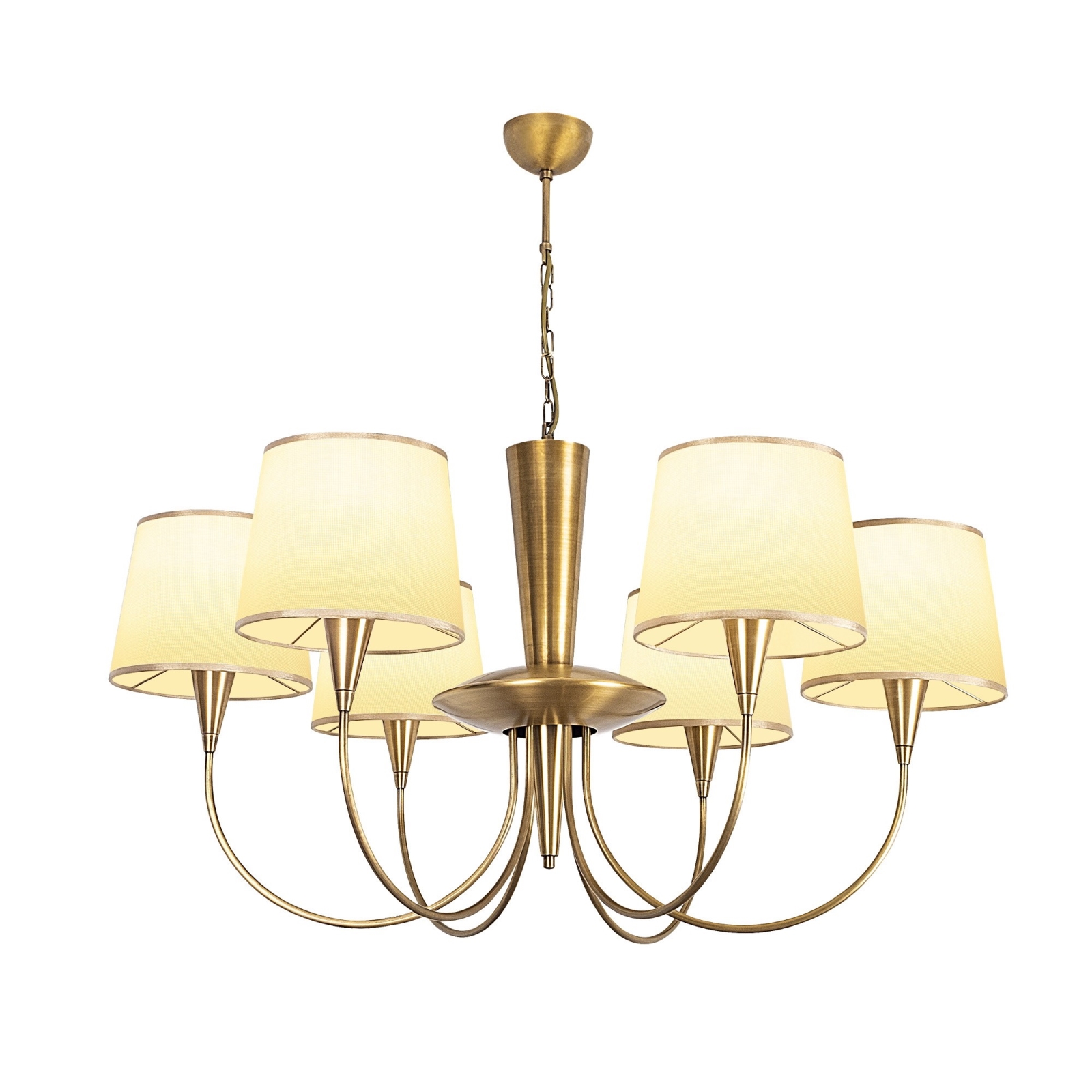 Kædeophængt lysekrone PARDO 6xE27/40W/230V guld/creme er kendetegnet ved et flot og funktionelt design.  En lyspære med E27-fatning passer til denne lampe. Her kan du købe andre pærer til fordelagtige priser. Du får en interessant tilføjelse til dit hjem.