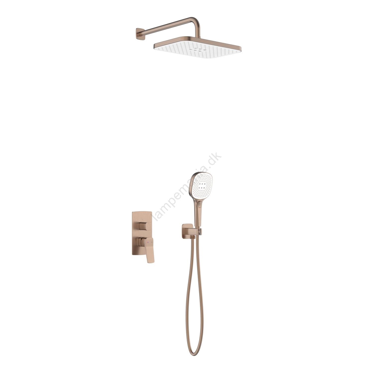 • Pakken indeholder: indbygningsboks, komplet armatur, brusearm, brusehoved med slange, skjult håndbruser med justerbar holder.