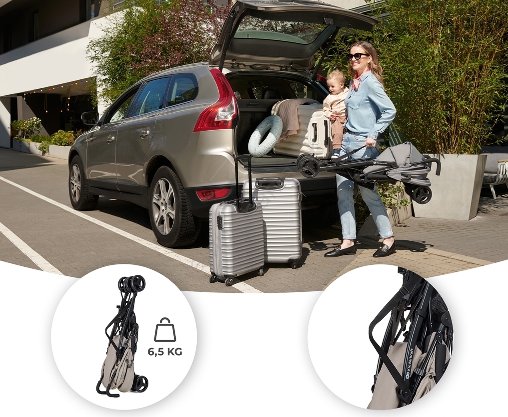 • Let og kompakt klapvogn, ideel til rejser og brug i offentlig transport.