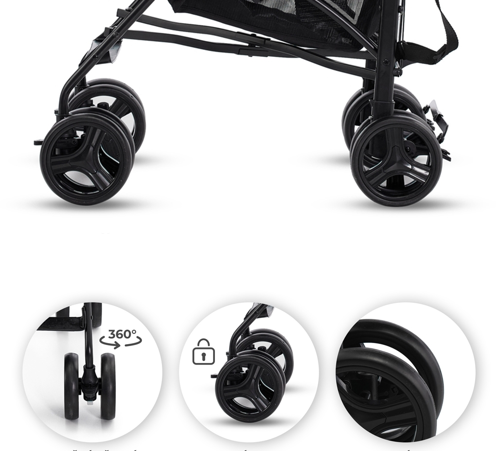 • Klapvognen har punkterfri hjul, som er lette og modstandsdygtige over for gennemboring.