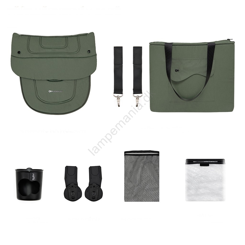 • Barnevognen leveres med en række praktisk tilbehør, såsom myggenet, benbeskytter til barnet, regnslag, drikkeholder, taske til håndtaget for forældre og adaptere til autostol.