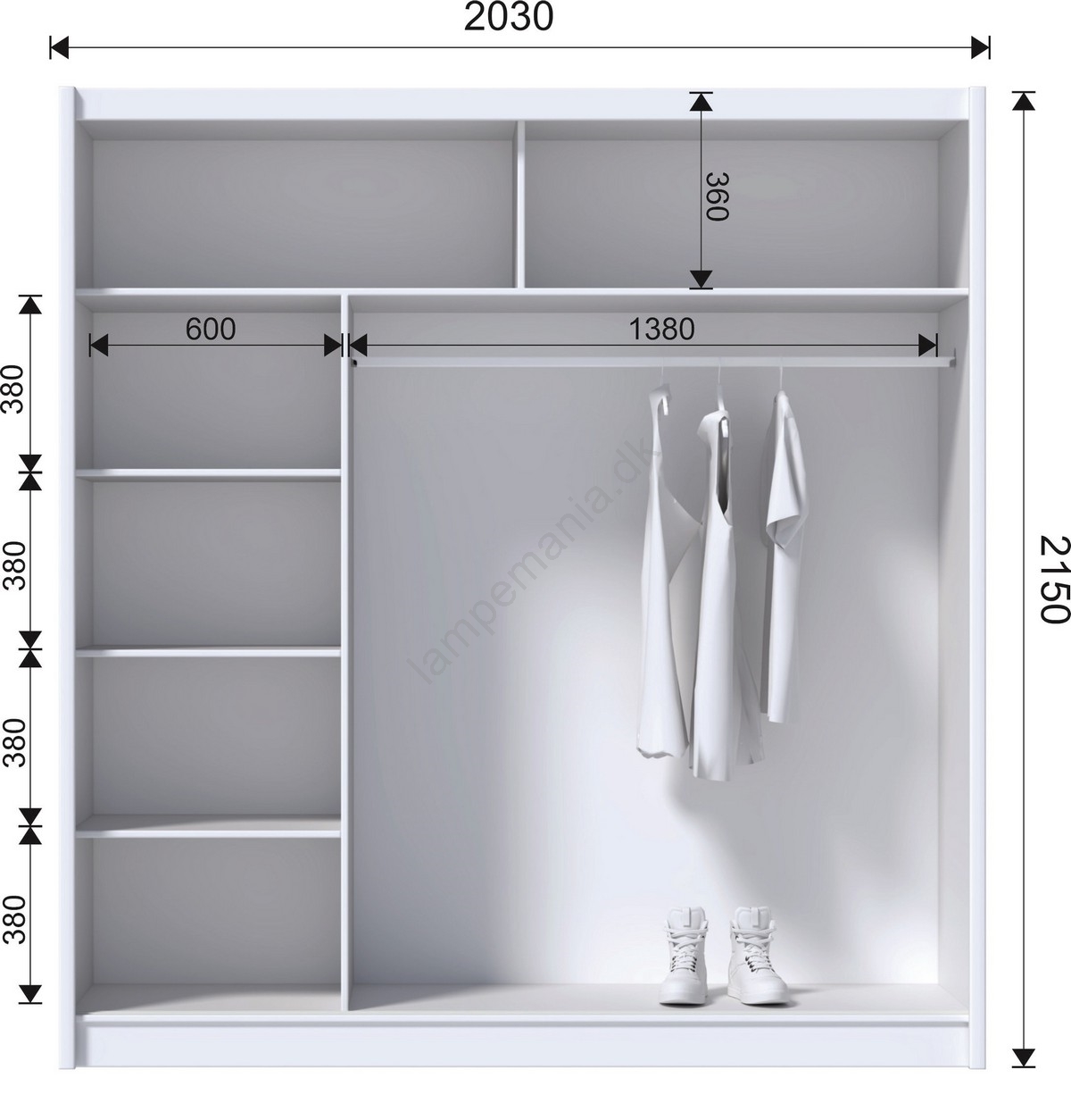 • Skabet har 4 åbne hylder, en garderobestang og 2 øverste hylder til opbevaring af tasker og sæsonbetonede ting.