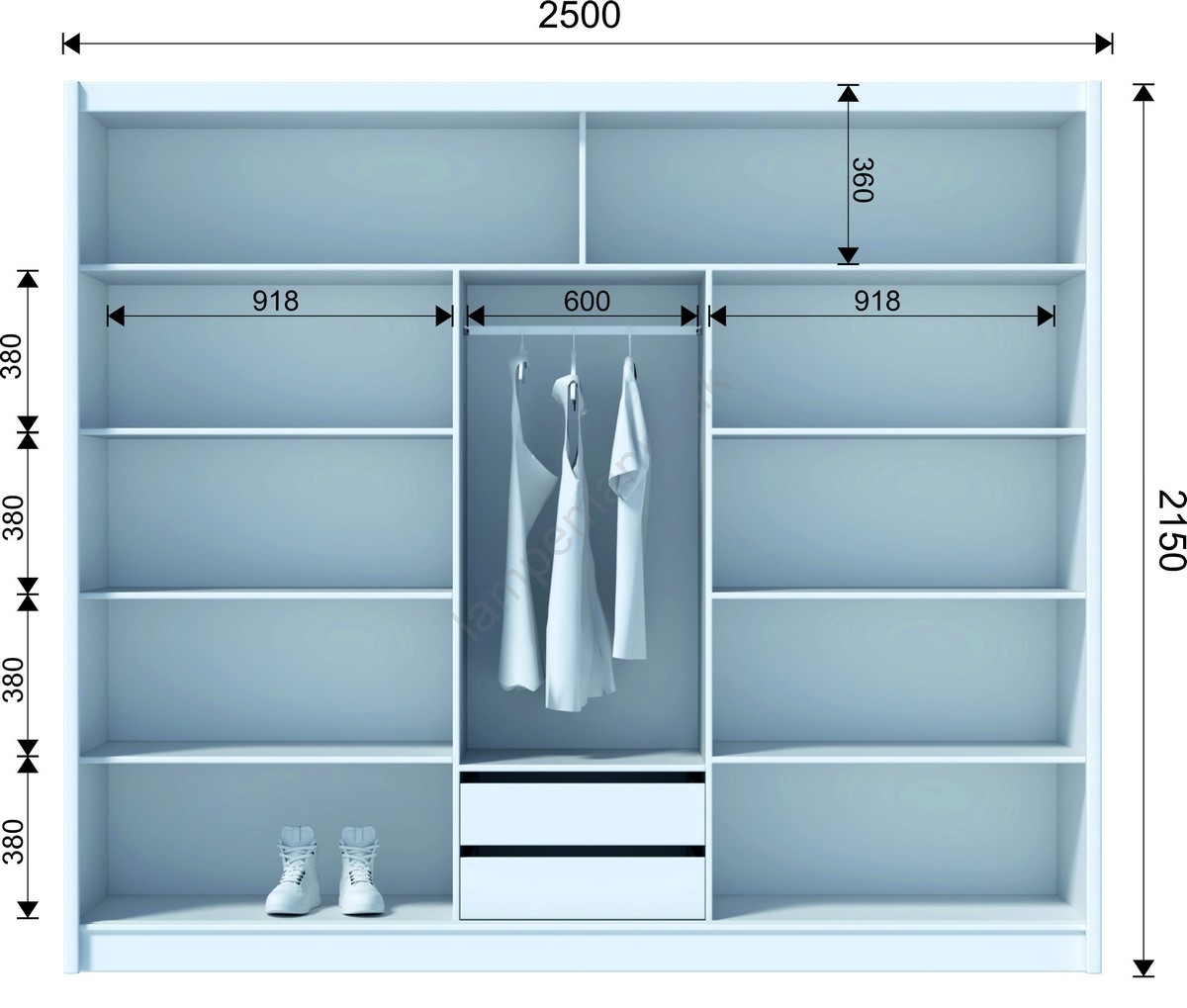 • Skabet har 8 åbne hylder, 2 skuffer, en bøjle til tøj og 2 øverste hylder til opbevaring af tasker og sæsonbetonet tøj.