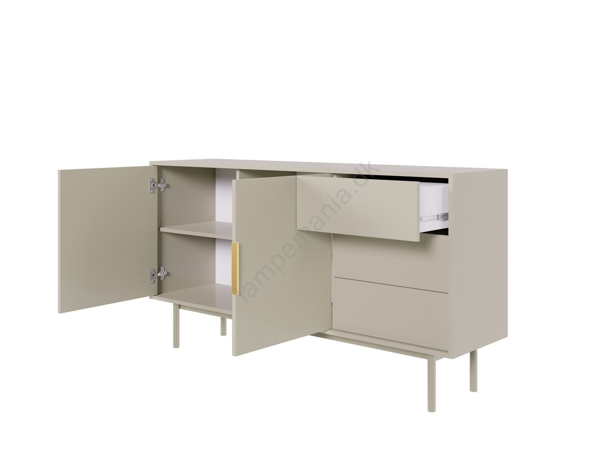 • Den har to låger i venstre side og tre skuffer i højre for overskuelig opbevaring.