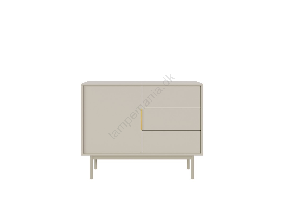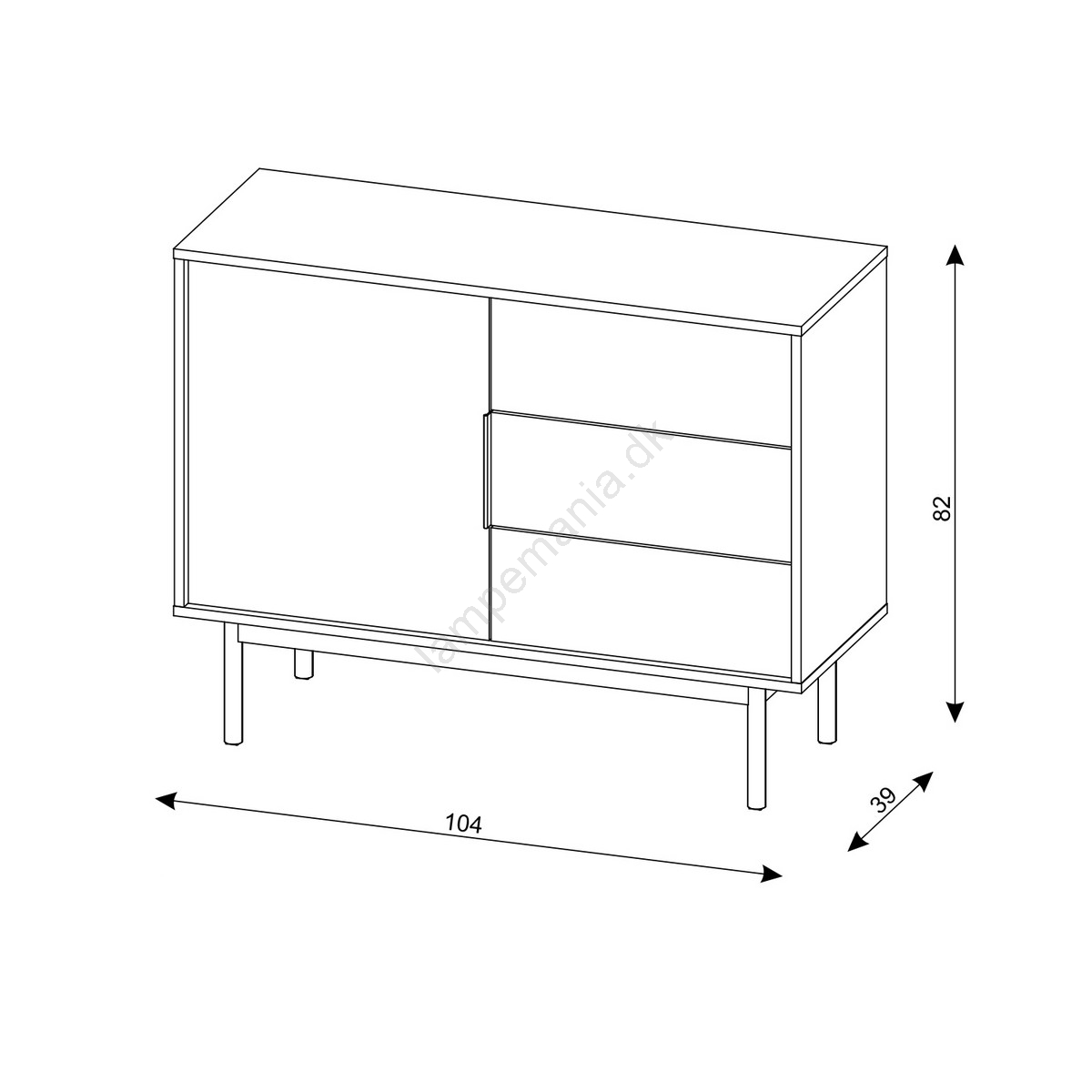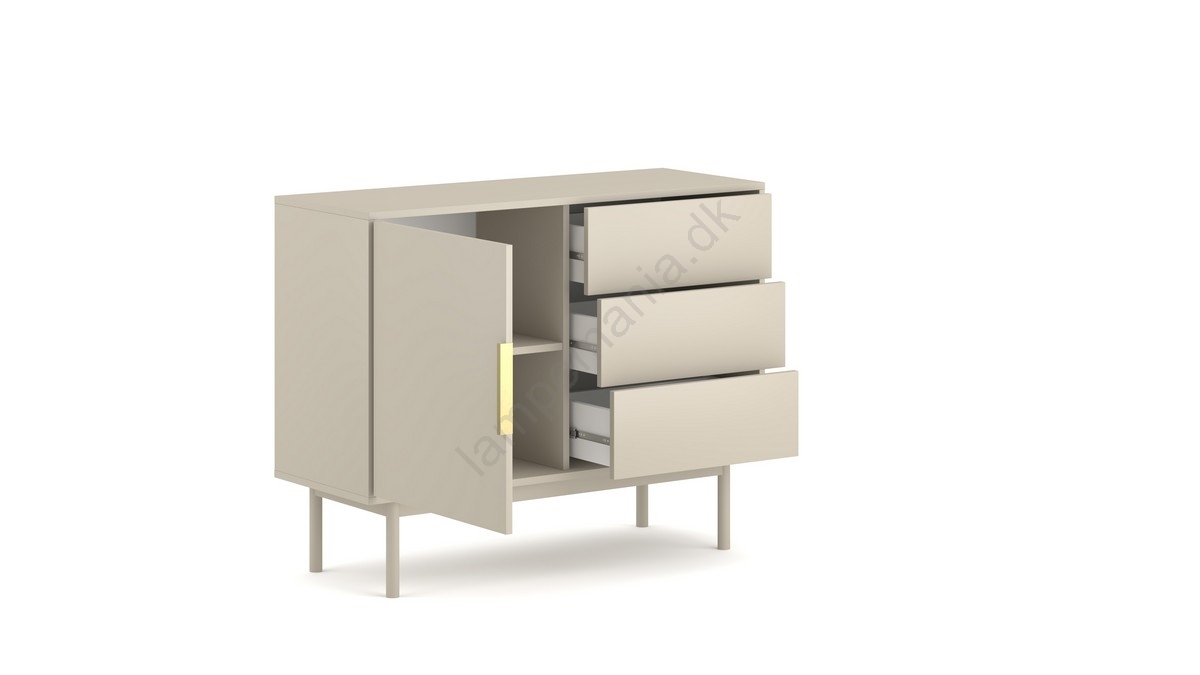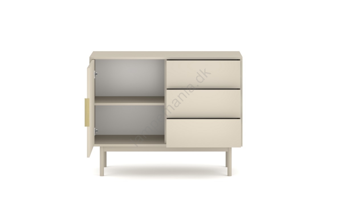 • Den har en låge i venstre side og tre skuffer i højre side til overskuelig opbevaring af dine ting.