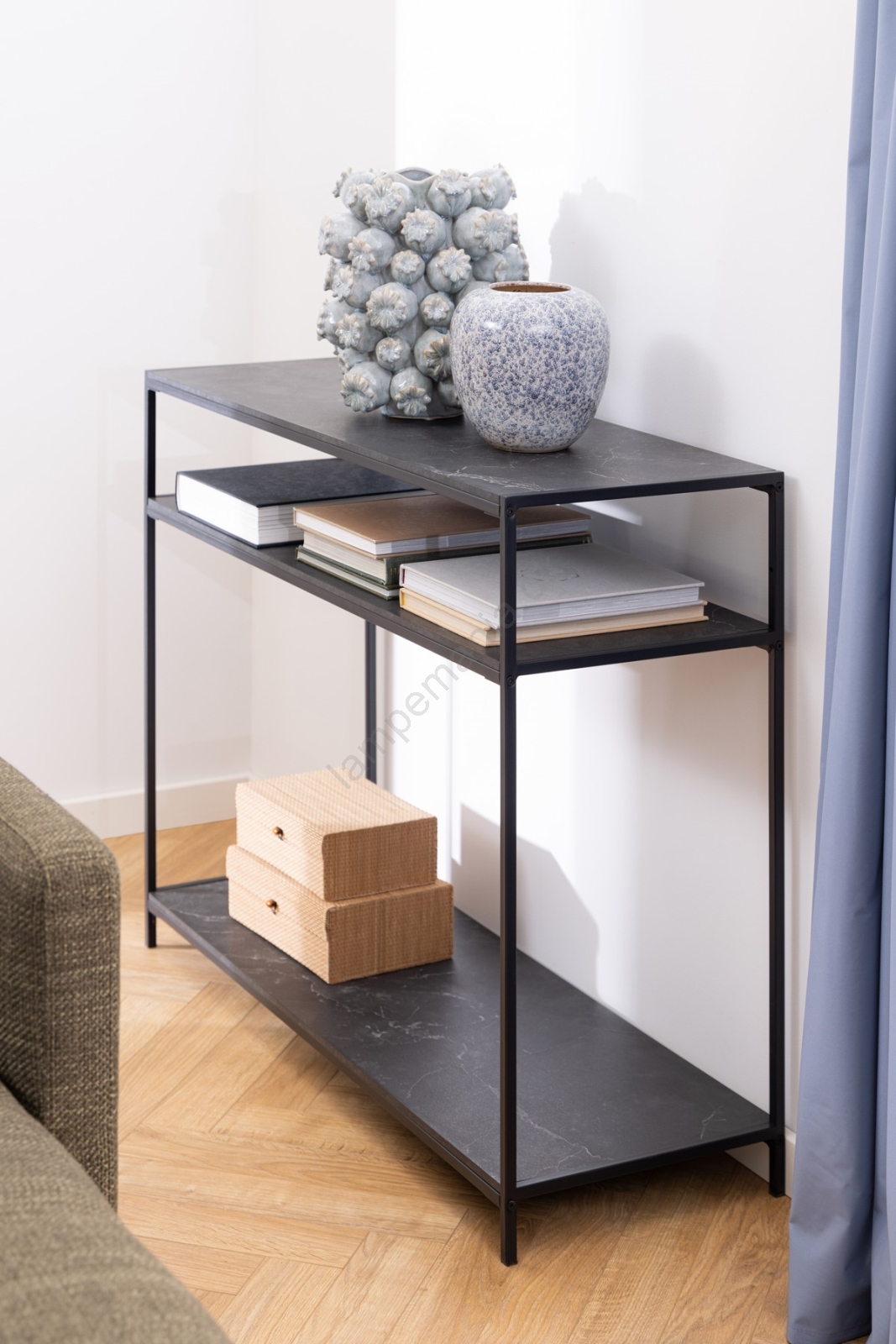 • Med rene linjer, marmorlook og sort pulverlak passer konsolbordet til entréen, stuen eller endda garderoben.