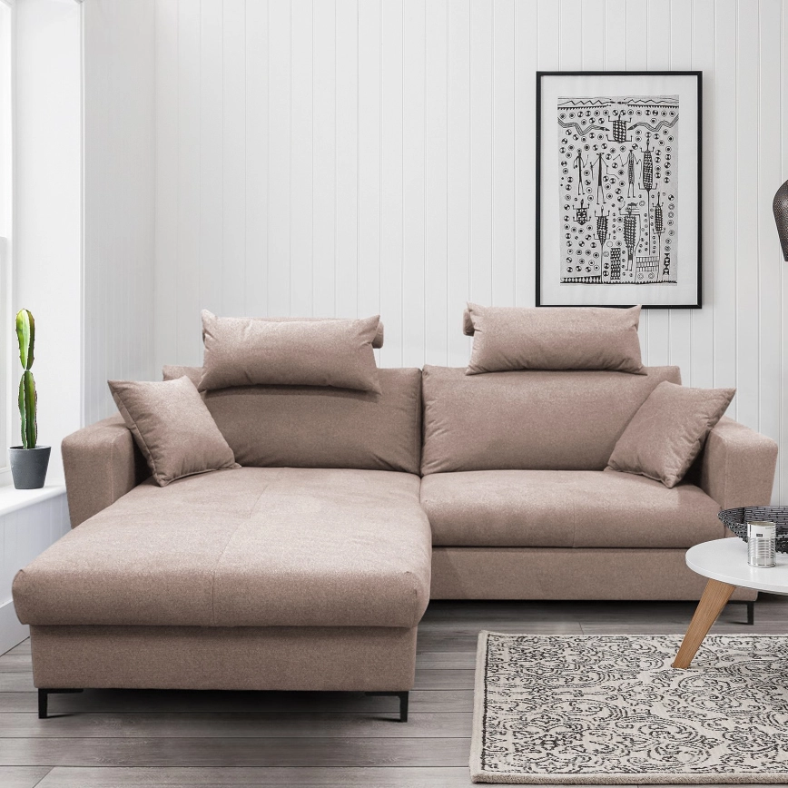 • HORTA venstrevendt L-formet hjørnesofa med sovefunktion og opbevaring, rosa
