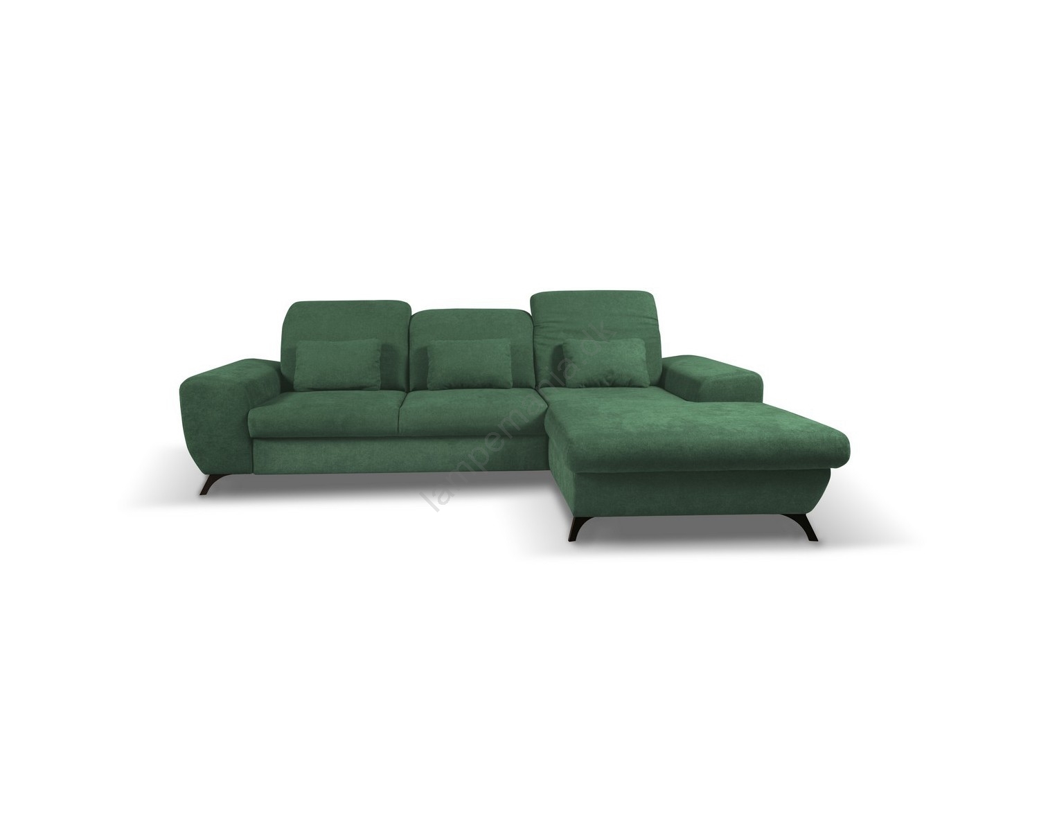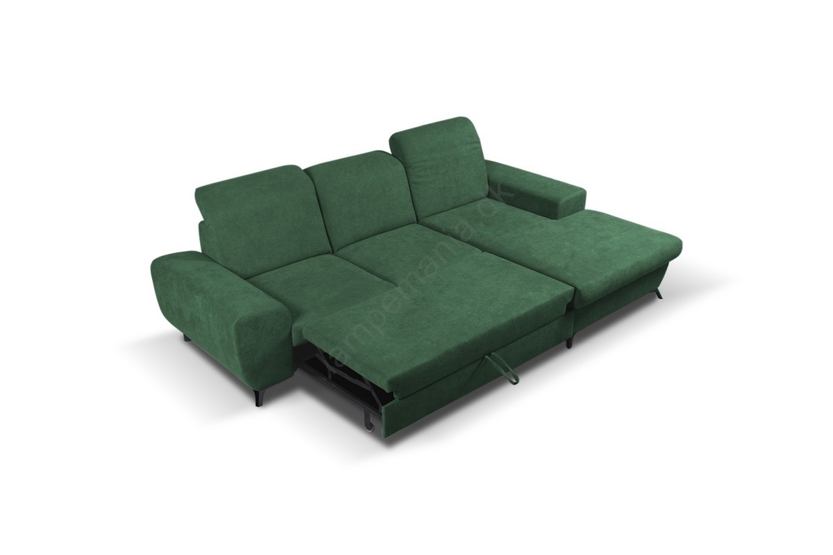 • Udtrækbar hjørnepolstret sovesofa ALTA i L-form med opbevaringsplads, venstrevendt, grøn
